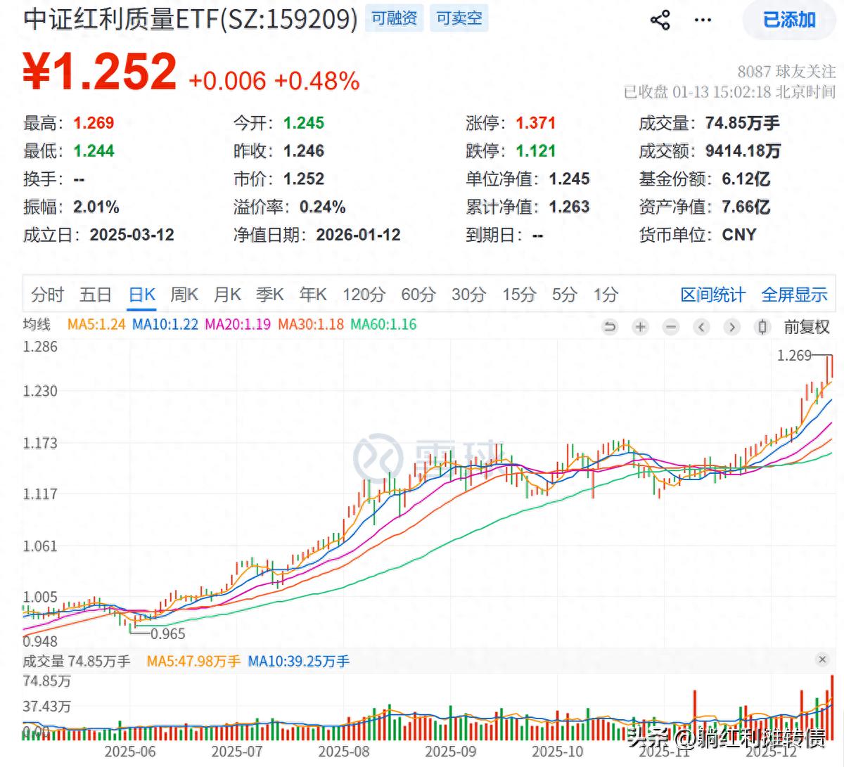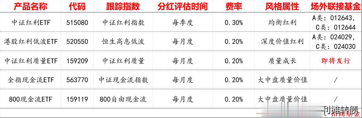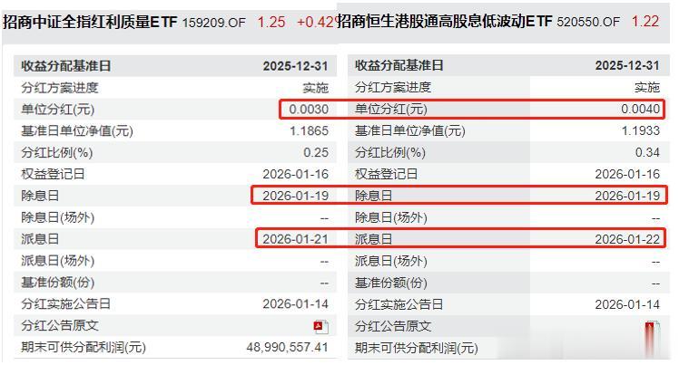 今天,中证红利质量ETF(SZ:159209)和港股红利低波ETF(SH:520550)这对月月评估分红的低费率(0.2%/年)又同步发出了分红公告,维持了0.003元/0.004元每份的稳定分红。除息日统一在1月19日,到账日分别是1月21日和22日。需要留意的是,深市ETF分红公告当天,会停牌一小时。今天朋友们很多都在问,就是这个原因。