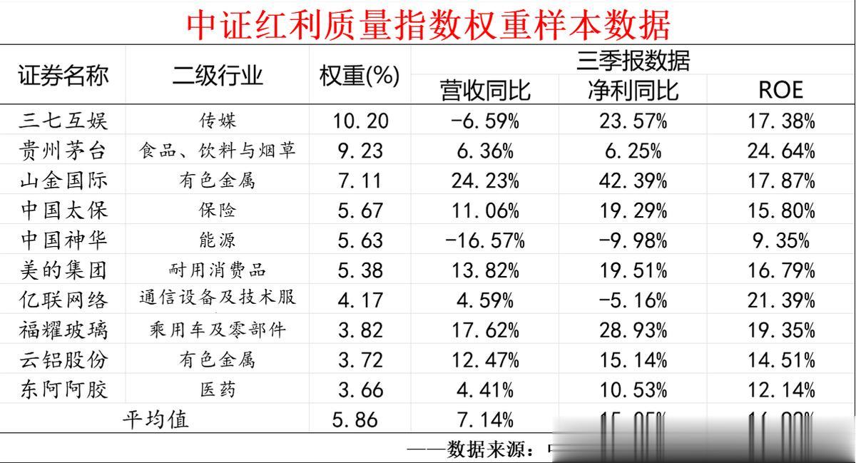 牛市环境下,市场对于高成长属性资产的偏好度会更高,而中证红利质量指数正是一只质量成长风格极其显著的红利指数,这在其十大权重股数据中表现得特别明显: