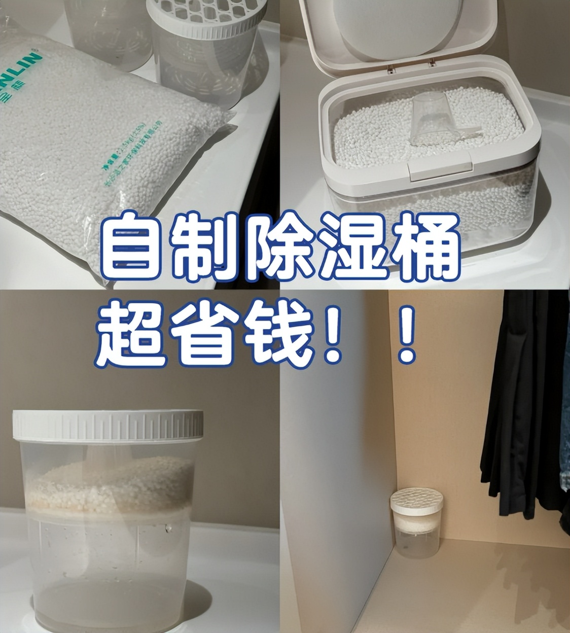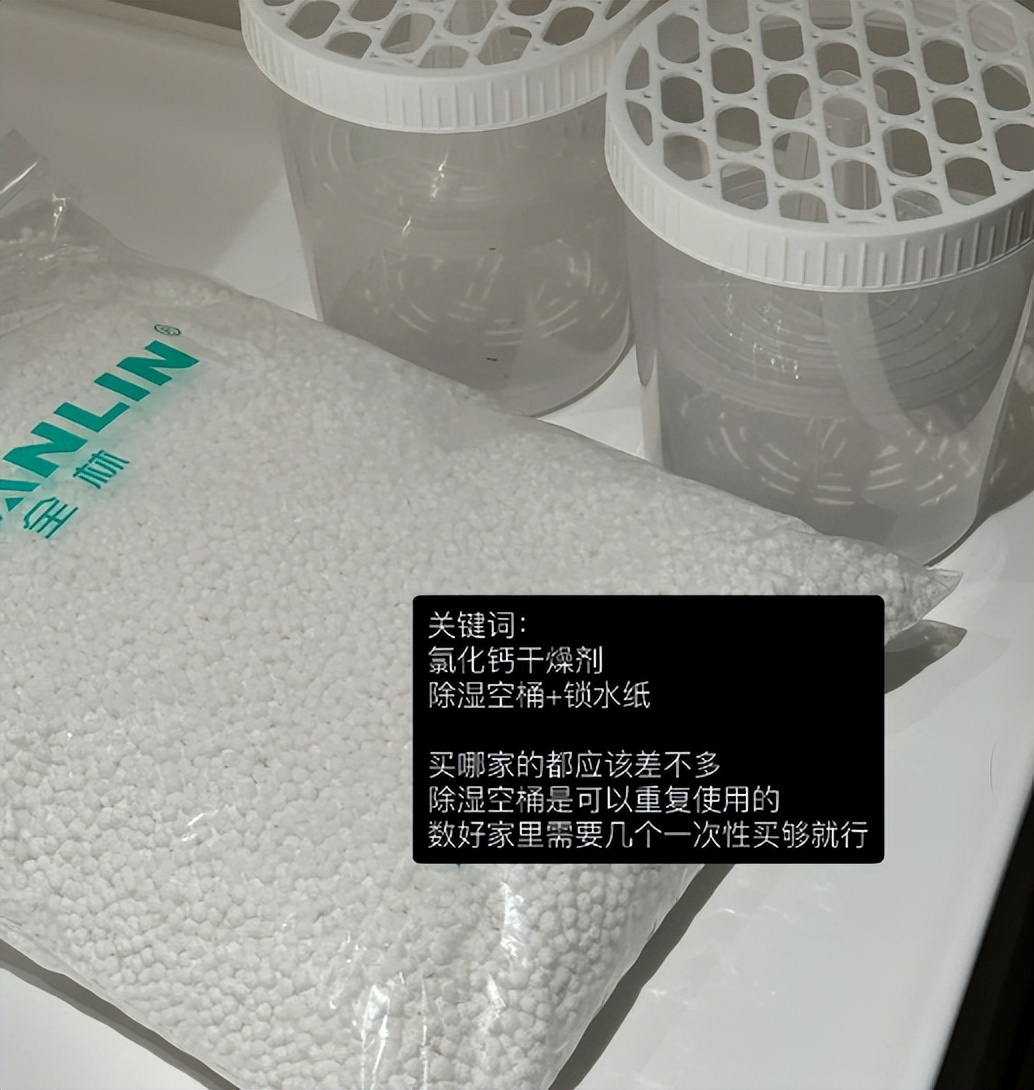 室内除湿很简单,只需要买一些氯化钙干燥器搭配一些除湿的空桶和锁水纸搭配着组装起来,放在家里各个角落就可以了。