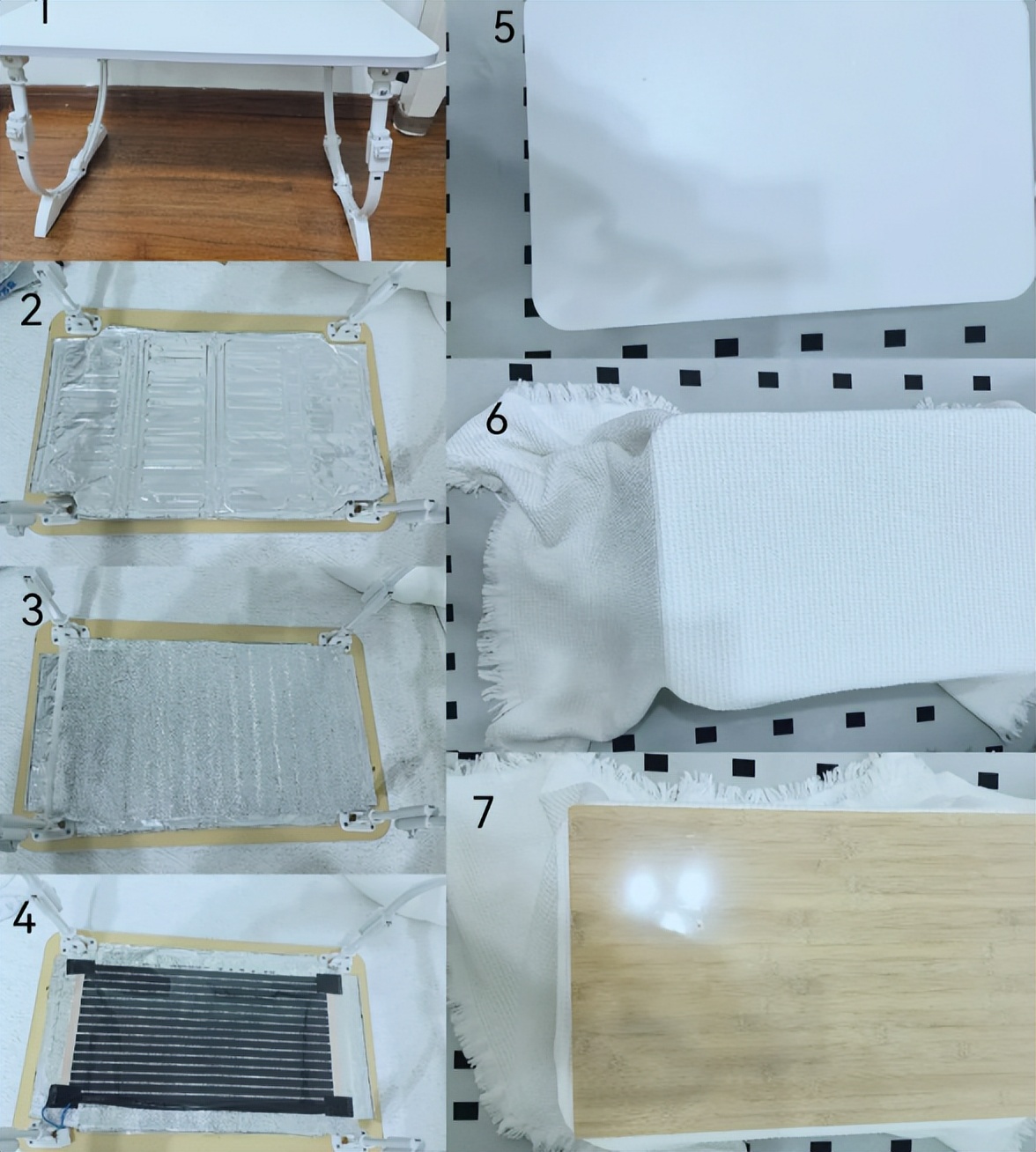 背面贴上一层锡纸(可以省略此步骤)、贴上反射膜、贴上石墨烯电热膜、接上电源线、铺上折叠成合适尺寸的毯子,放上同尺寸的切菜板,大功告成。