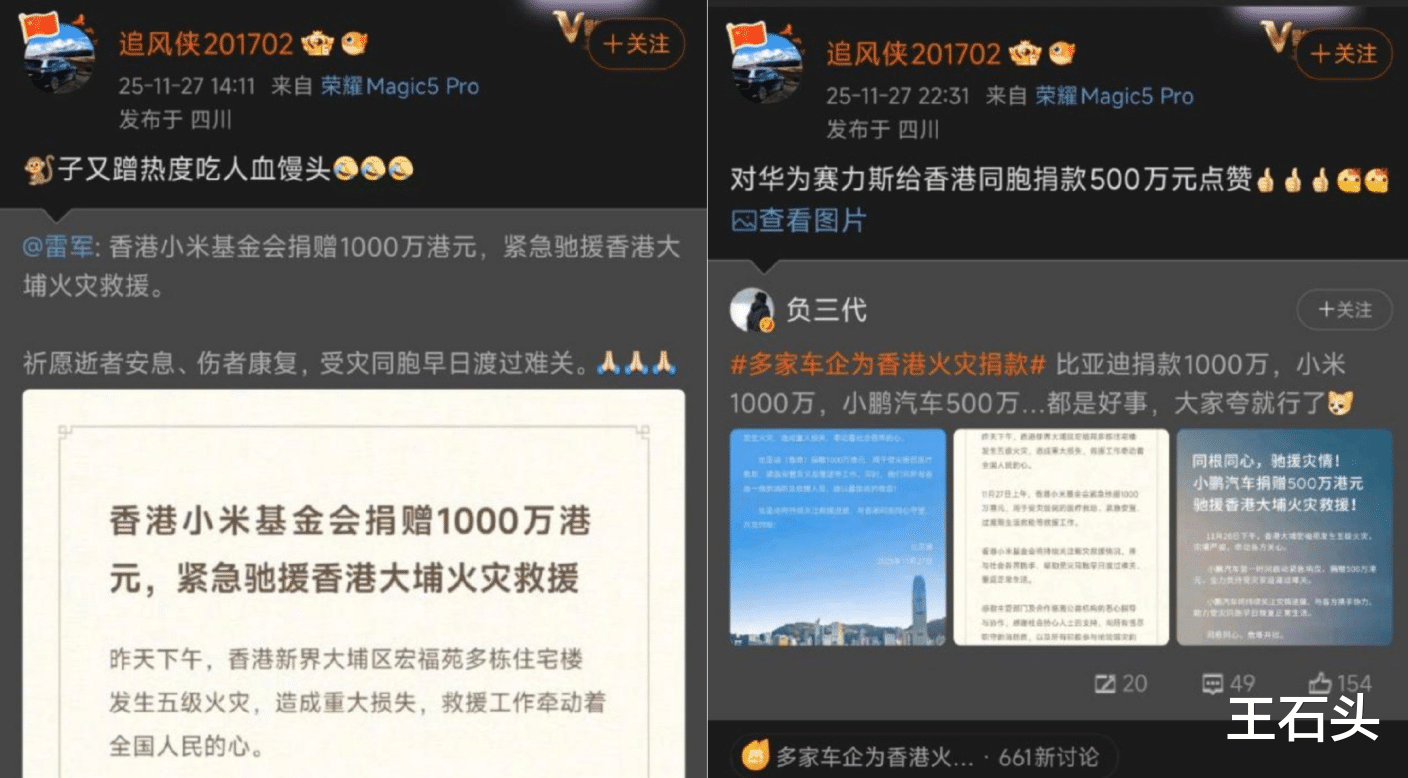 特别是在赛力斯也宣布捐赠500万港元后,网络上又出现了极端对立的情绪,比如就有网友拿两家企业的捐款搞对立。