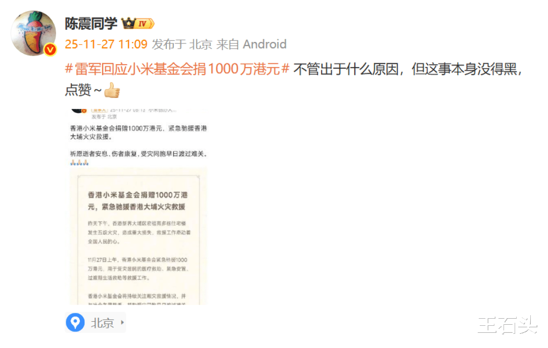 在香港发生火灾并造成重大损失后,小米第一时间宣布捐赠1000万港元支援救灾工作,展现了企业对社会责任的积极响应。