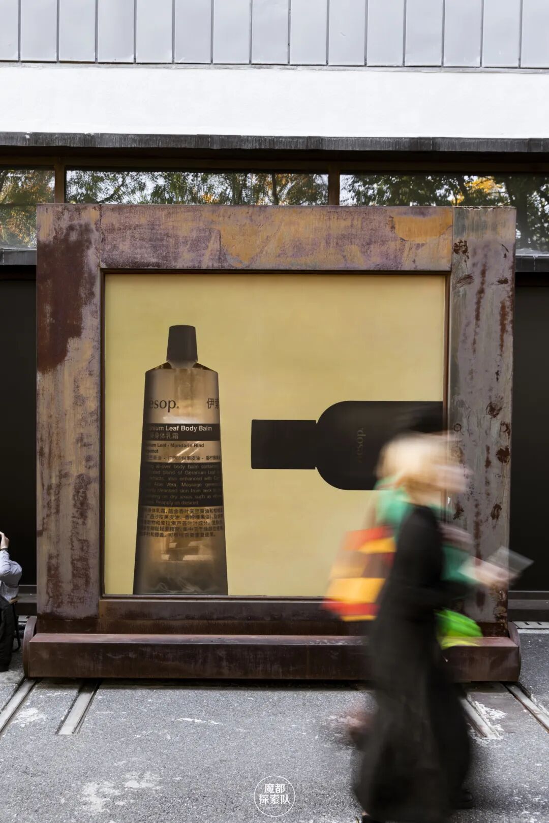 上海当代艺术博物馆外街,三面Aesop伊索的围挡已悄然立起,以舒适的木制材质、精妙的构图与留白的诗意,向过往的行人发出无声的邀约,引导着我们从喧闹的街道,过渡至一个专注感知的静谧世界。