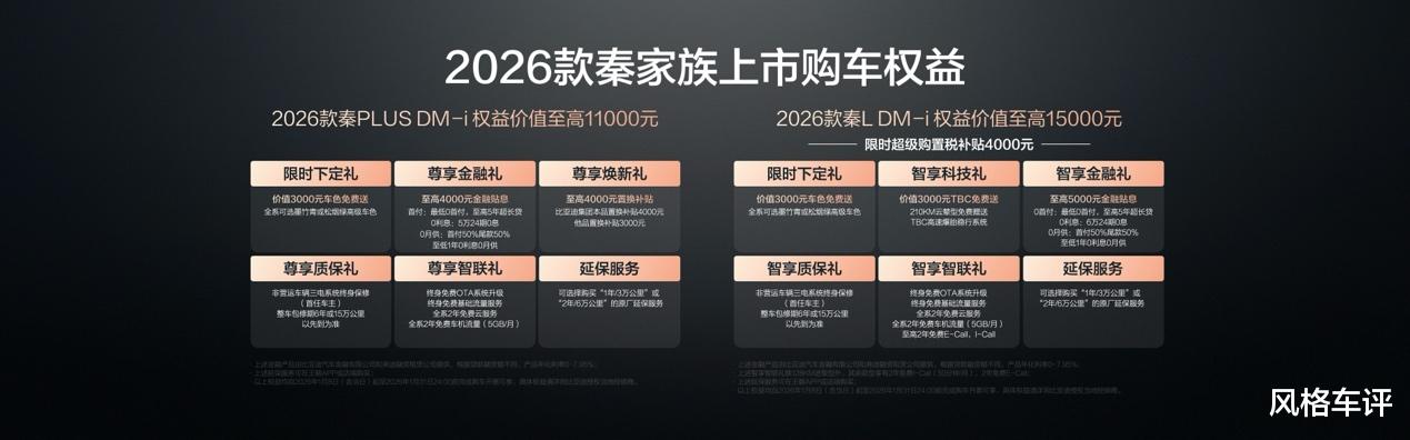 为了回馈消费者,此次上市还伴随着极具诚意的购车权益。对于购买2026款秦L DM-i 210KM长续航版的用户,在1月31日前下单可享受限时超级购置税补贴4000元,购买210KM云辇型还可免费获赠TBC高速爆胎稳行系统,权益价值至高可达15000元 。而对于选择2026款秦PLUS DM-i 210KM长续航版的用户,同样在1月31日前下单,不仅有至高4000元的置换补贴,还免费赠送价值3000元的全新车色以及至高4000元的金融贴息,权益总价值至高11000元,进一步降低了年轻家庭的购车门槛 。