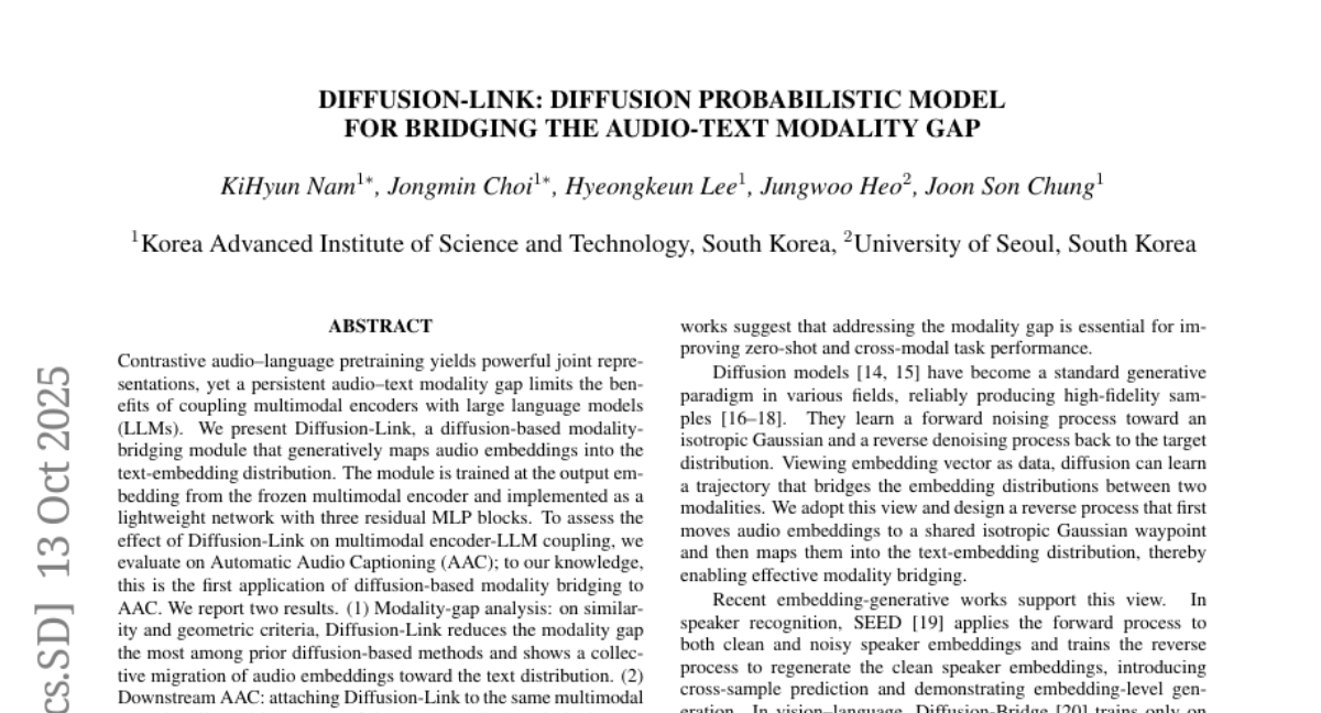 在2025年10月的arXiv预印本论文中,韩国科学技术院(KAIST)的研究团队和首尔大学合作发表了一项突破性研究。这篇题为《Diffusion-Link: Diffusion Probabilistic Model for Bridging the Audio-Text Modality Gap》的论文由南起炫、崔钟民、李炯根、许政宇和钟俊善共同完成。有兴趣深入了解的读者可以通过论文编号arXiv:2510.11330v1查询完整论文。