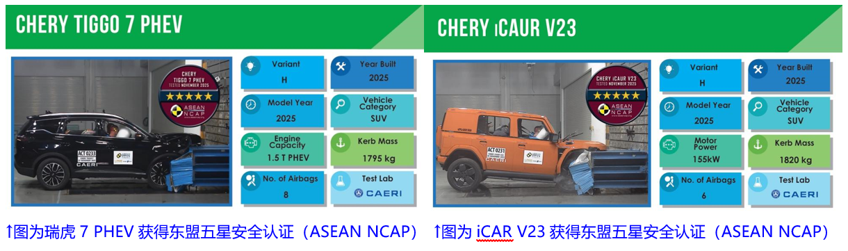 “安全奇瑞”在全球顶级安全评测中再获突破:在东盟新车安全评鉴(ASEAN NCAP)评级中,瑞虎7 PHEV不仅拿下五星安全,更以94.68的综合得分,打破了该机构自2011年成立以来的最高分纪录;iCAR V23(海外名称iCAUR V23)成为获得ASEAN NCAP认证的首款“五星方盒子”车型。