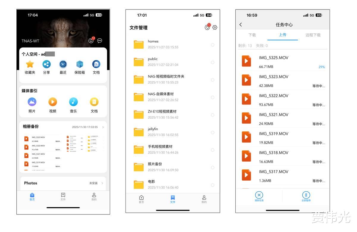既然移动存储设备已经很少用到了,那么其实另一需求就会增加,那就是随时远程传输文件,铁威马F4-425 Plus 支持多种Bond聚合模式,再加上它支持双5GbE端口传输,最高速度可以达到1010MB/S,只要带宽足够、选用的硬盘性能好,传输速度飞快,像下面截图就是用手机拍摄了10几段短视频素材之后,直接登录TNAS mobile 3C APP,通过文件管理,远程将刚拍摄的素材直接传回F4-425 Plus保存,传输完毕,手机上直接就删除了,不会像以前那样总是提示内存不足。