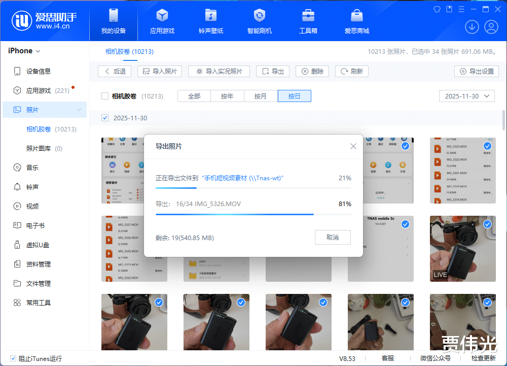 不过带来的另一个问题是,很快台式电脑和笔记本电脑的硬盘都不够用了 ,这也是为什么要入手NAS的最主要原因,与给电脑扩容硬盘,不如直接上NAS,使用起来更加方便,比如下面就是将当天拍摄的素材,不经过电脑上的硬盘,直接导出到F4-425 Plus的磁盘上,方便快捷。