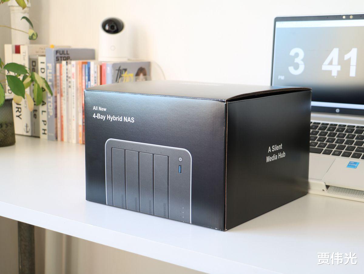 打开包装,可以看到这款NAS产品是长方体的机身,银灰色铝合金外壳很有质感,符合理工男功能优先的硬朗设计风格,兼顾了结实坚固与美观优雅,跟我的电脑颜色、桌面颜色还挺搭。