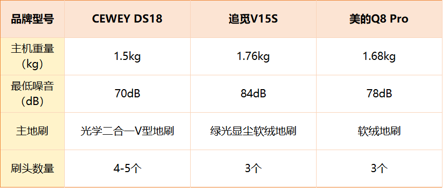 从上面的数据来看,在使用体验上,CEWEY DS18 延续轻量化与静音设计,主机重量1.5kg,噪音控制在70dB,使用舒适度高。标配光学二合一V型地刷,并配有4~5个功能刷头,能灵活应对地板、地毯、沙发、缝隙等不同场景。追觅V15S主机重量偏重,而美的Q8 Pro主机重量相对中等,但噪音偏高。总体来看,CEWEY DS18 在轻量、静音与多刷头组合上表现最为均衡,适合对手感与噪音敏感的家庭使用。