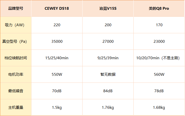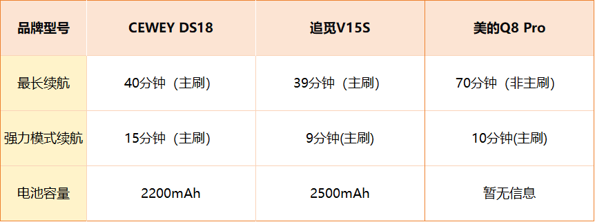 从上面的数据可以看出,在续航方面,CEWEY DS18 采用2200mAh锂电池,标准模式可连续使用40分钟,强吸模式续航15分钟。追觅V15S标准模式续航39分钟、强吸9分钟,美的Q8 Pro标准模式70分钟但是并非主刷测的。整体来看,CEWEY DS18 的续航与吸力表现相对均衡,能够保证高功率下的稳定清洁时间,适合需要频繁打扫的家庭用户。