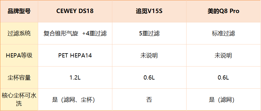从上面数据来看,过滤结构方面,CEWEY DS18 采用复合锥形气旋+4重过滤系统,配合PET HEPA14高等级滤芯,能有效阻隔微尘、螨虫与过敏原,过滤精度达医用级。1.2L尘杯容量大,滤网与尘杯均支持水洗,使用维护成本更低。追觅V15S为5重过滤结构,但尘杯容量偏小,也不支持滤网水洗。而美的Q8 Pro采用标准过滤结构,也是尘杯大小相对于小了。对比来看,CEWEY DS18 在过滤精度、尘杯容量与清洁便利性方面都更具实用性。