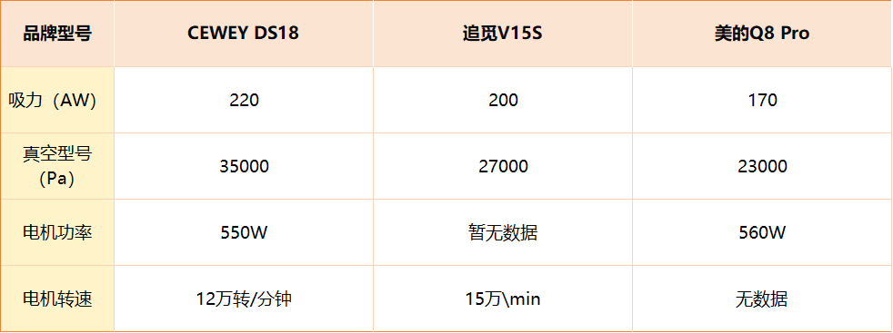 我们将聚焦决定吸尘器吸力性能的几个关键指标:官方公布的最大吸力值(AW)、真空度(Pa)、电机功率和电机转速。通过这些核心参数,我们可以分析各款产品的理论极限性能和技术侧重。