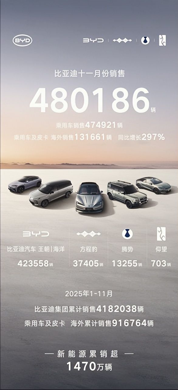 进入2025年12月才2天,比亚迪上月的销售数据就拿出来了,真的是亮眼呀,可谓卖疯了,新能源汽车领军宝座真的是坐的太稳了,一丝不动,同时高端品牌强势推进,市场表现更是抢眼。