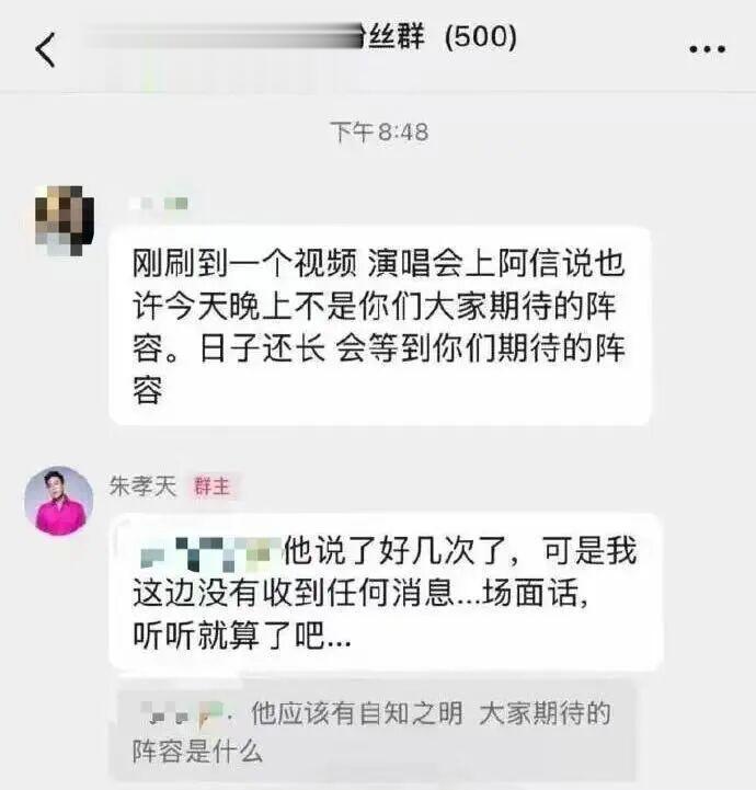 随后,朱孝天在粉丝群隔空回应:他说了好几次了,可我这边没有收到任何消息,场面话,听听就算了吧……