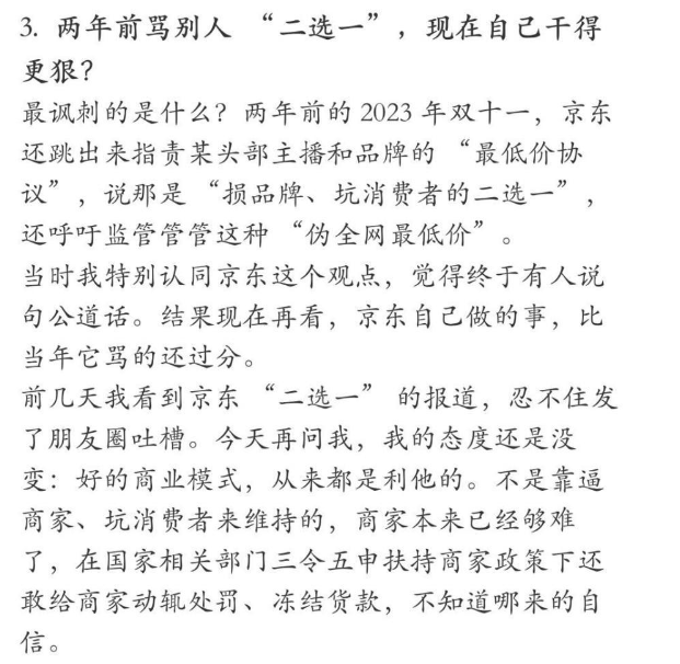 李文涛还提及京东此前立场的矛盾性,称其2023年曾批评某头部主播的“最低价协议”是“二选一”,如今却采用更严厉手段限制商家。