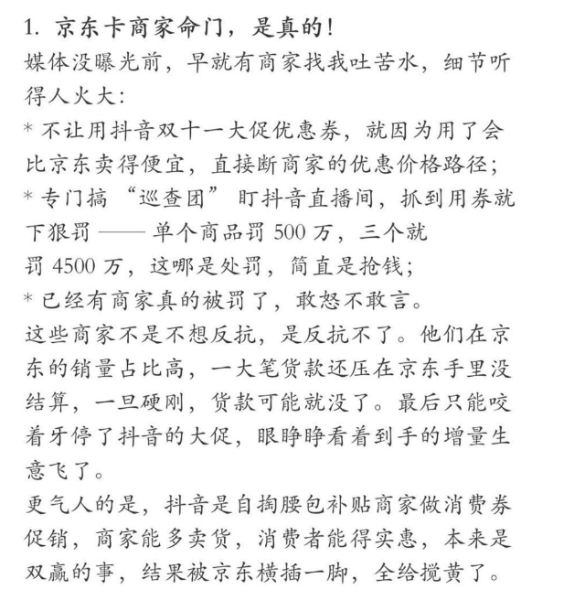 “双十一优惠券是促销核心,不准用券本质就是不准参与抖音大促,这就是二选一,没什么好洗的”。