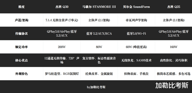介绍为了做这篇横评,我的客厅几乎成了音箱阵地。目前我手头长期深度体验的包括:马歇尔STANMORE III、杰科Q30、杰科Q25、贝尔金SoundForm Elite。除此之外,为了保证测试公平,我也备好了无损音源播放器以及专业的录音采集设备,力求把每款音箱最真实的“性格”剖析给大家。
