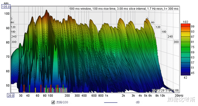 最后看看瀑布图,在150Hz - 200Hz 的“山脊”,可以看到低音听起来量感足,但是有余韵。这也是因为Q30的7.1.4声道营造氛围感的一种方式。