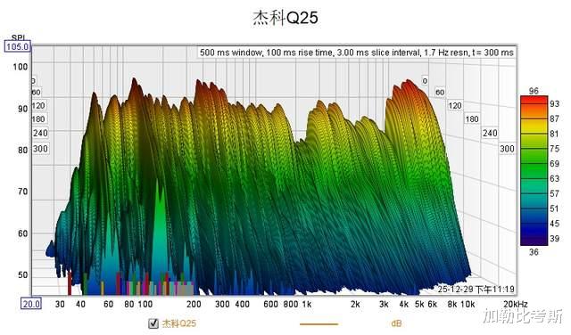 图表右侧的瀑布下落速度很快。这证明了Q25对高频瞬态的反应非常灵敏。在Wi-Fi 模式下播放快节奏的钢琴曲或吉他扫弦时,声音起得来、收得住,不会拖泥带水。中低频部分有一定的拖尾,这种适当的余韵营造了一种宽松的听感。