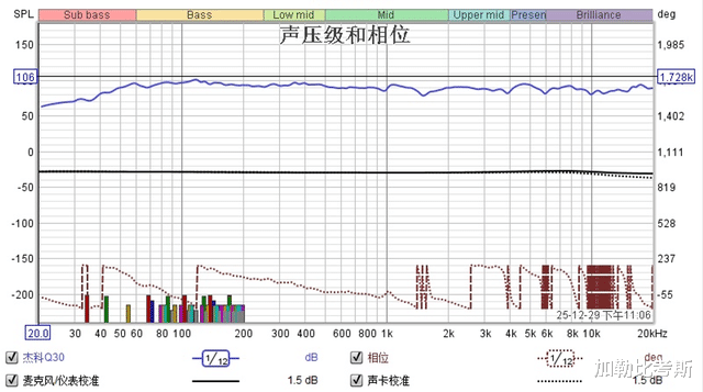 看看实测频响图,在100Hz - 200Hz 这个负责打击感的核心区域,它的能量非常充沛。这得益于它那颗 5.5英寸碳纤维独立低音单元 。Q30的低频是经过DSP专门调校的,为了配合全景声电影和臻品音乐的动态范围,爆发力极强。