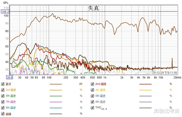 再看失真图,在我们的暴力测试下,中高频的失真控制得非常干净。这验证了官方宣传的“自研音腔驻波抑制技术”是真材实料。即便在大动态下,也没有明显的箱声干扰。
