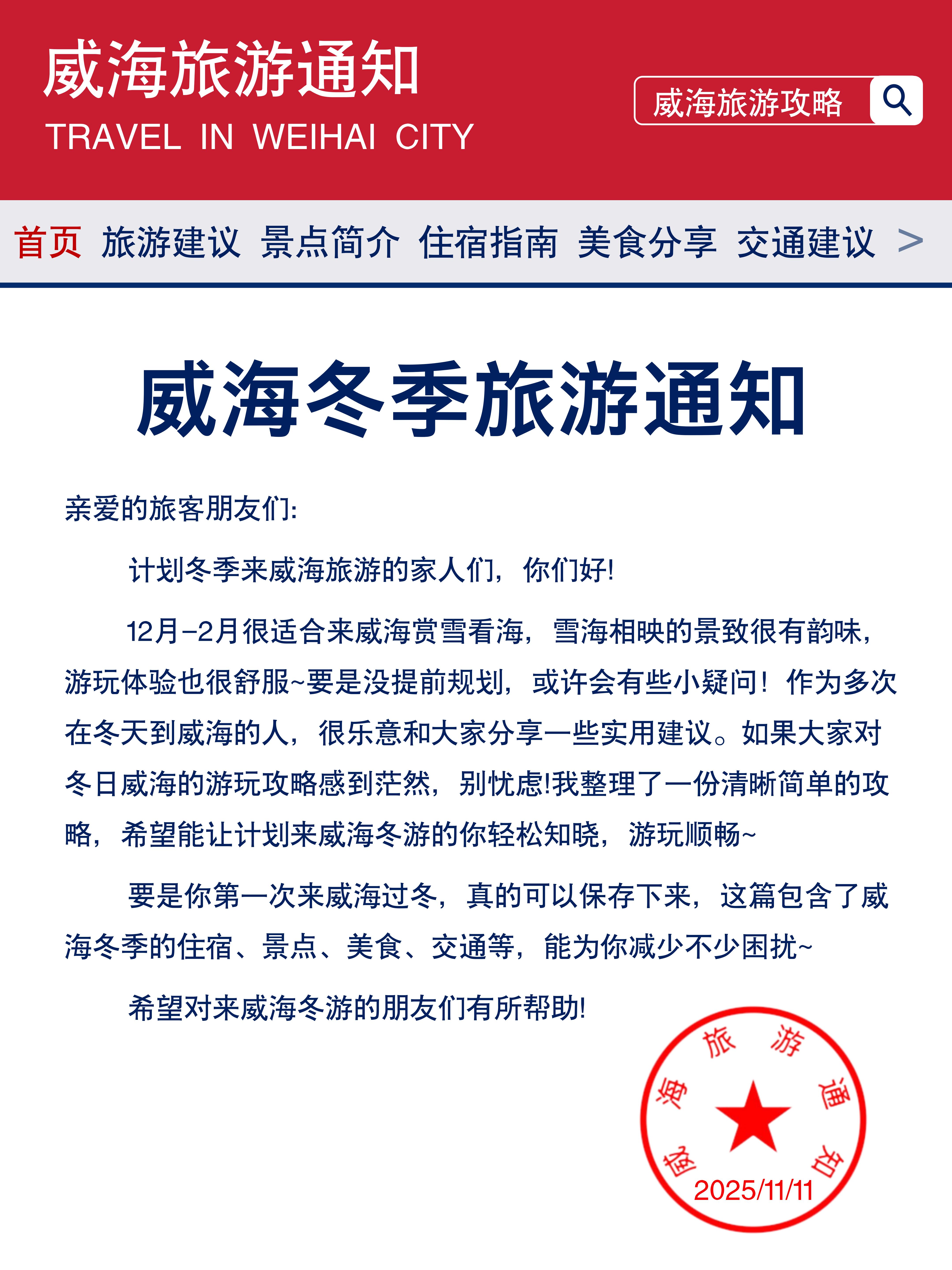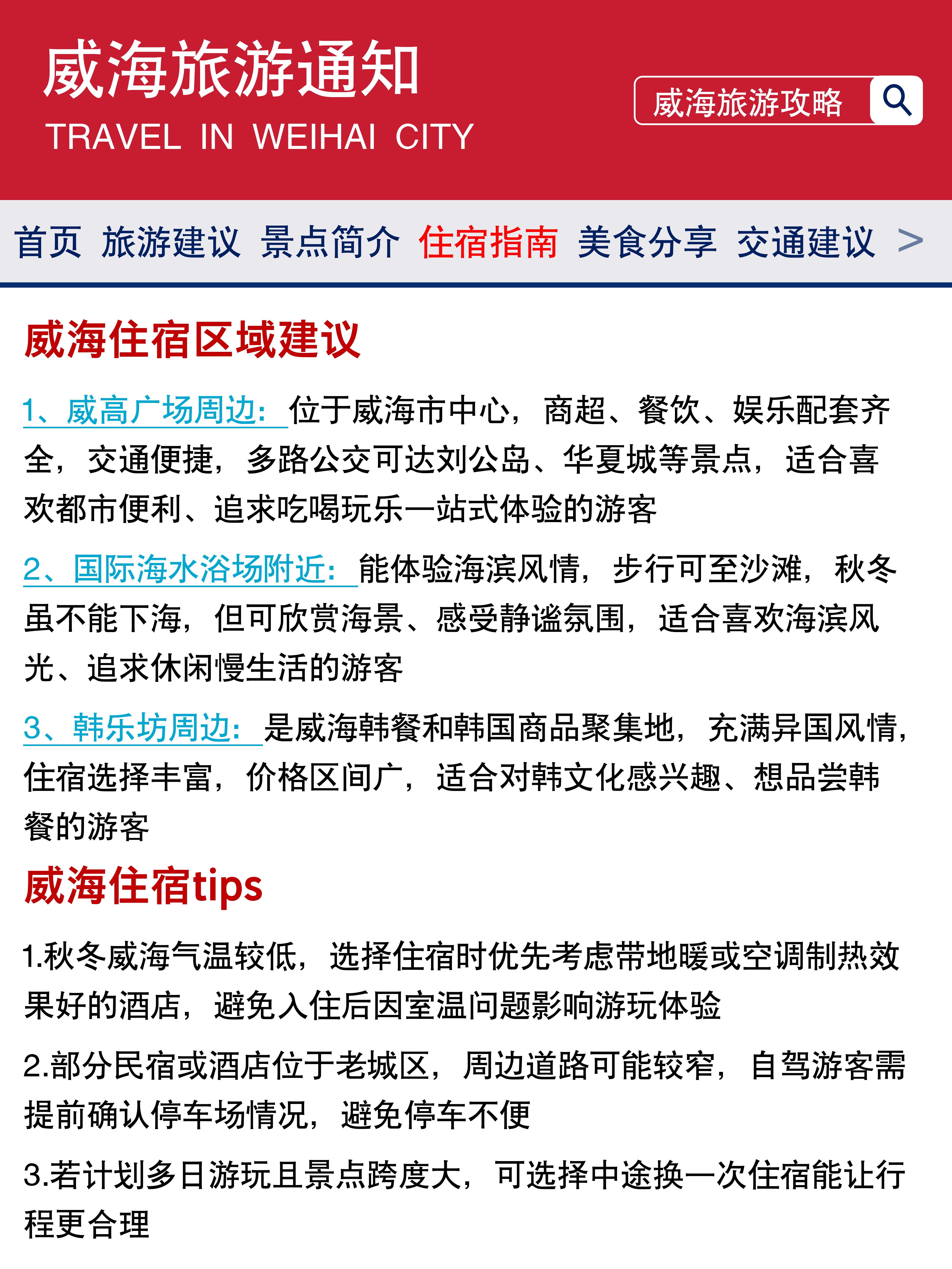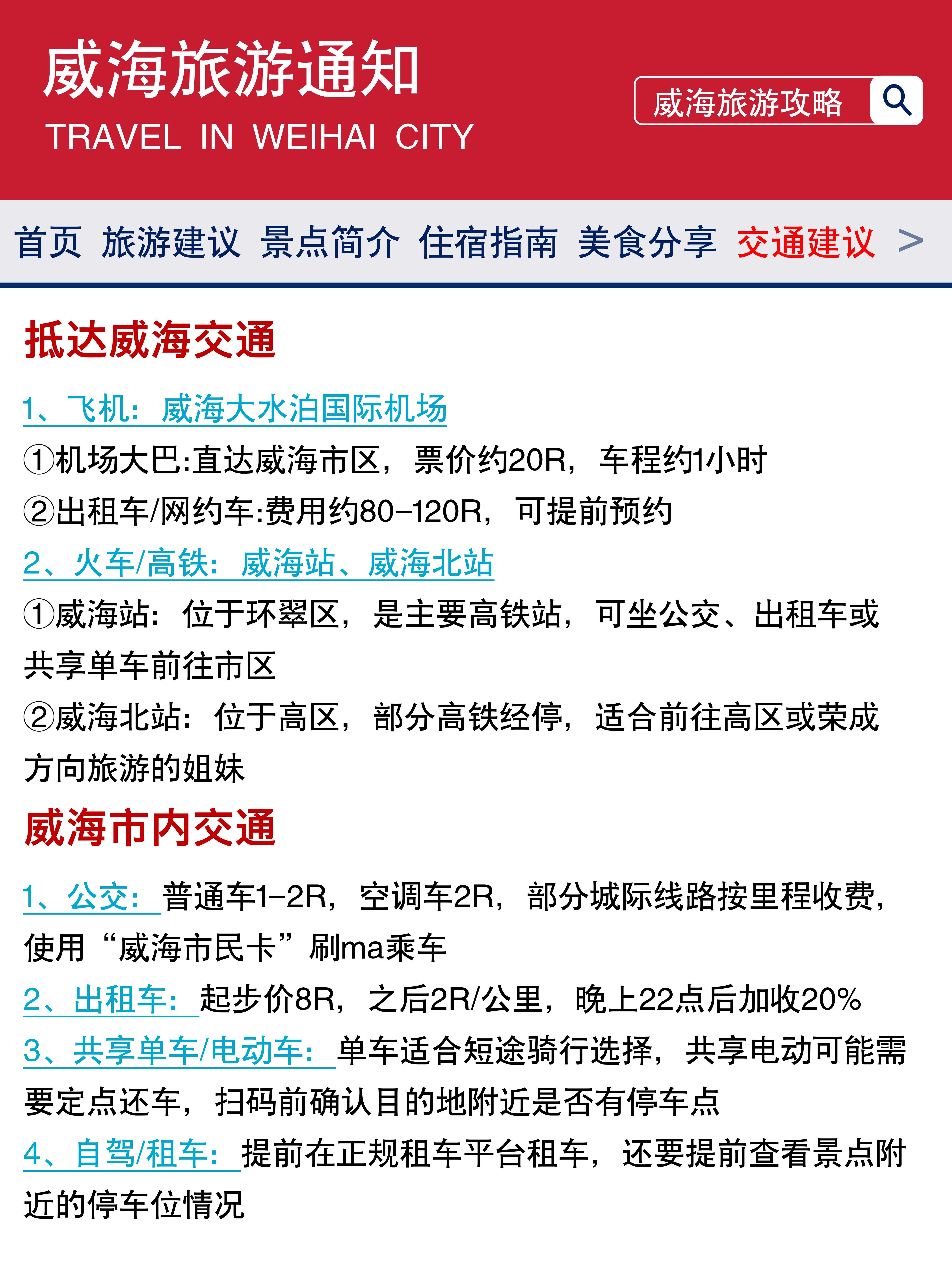 •长途汽车:威海汽车站(邻威海站),衔接周边城市