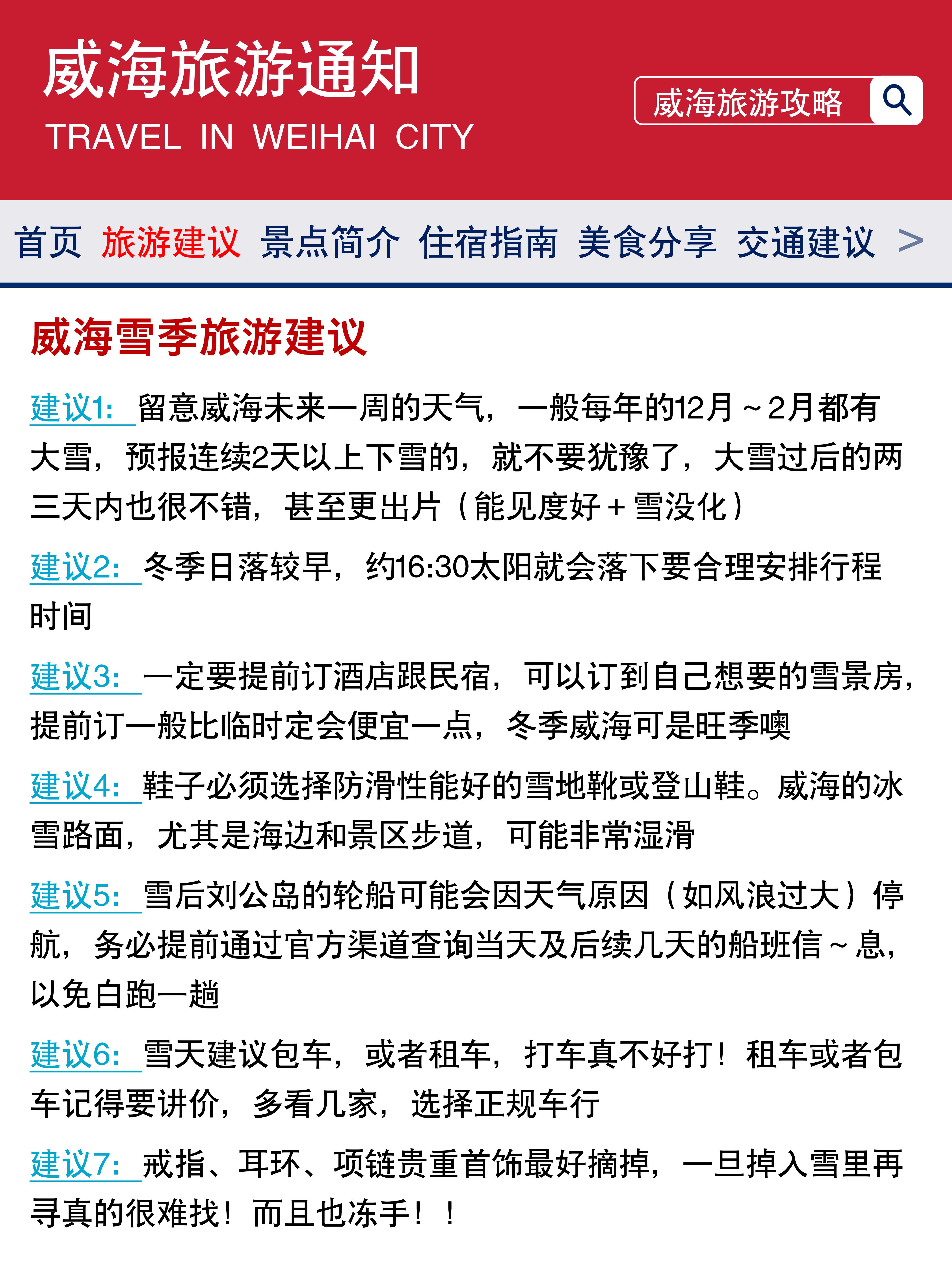 1.留意威海未来一周的天气,一般每年的12月~2月都有大雪。