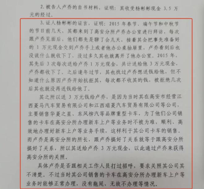 判决书还显示,瑞菱公司负责人杨彬彬于2015年春节、端午节、中秋节三次到车管所高安分所“拜访”卢乔,并将事先准备好的现金交给卢乔或放在其办公桌抽屉,共计3万元。