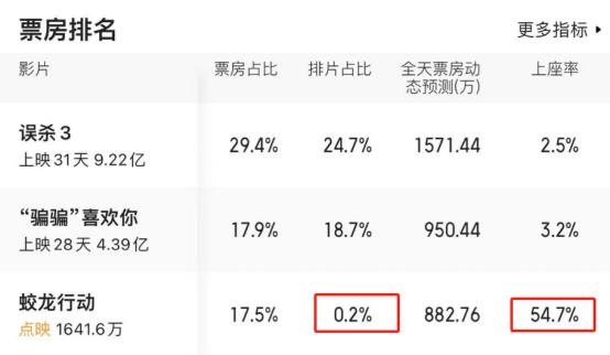 根据“猫眼”数据,《蛟龙行动》点映排片仅有0.2%,但上座率达到54.7%,空前绝后,绝无仅有。