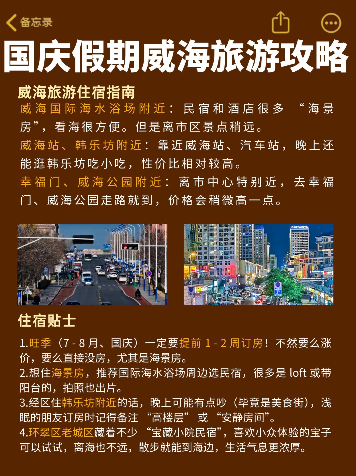 ⛪追求性价比 + 交通方便:选威海站、韩乐坊附近。离车站近,拖行李箱不累;晚上还能逛韩乐坊吃小吃。不过这边是美食街,晚上有点吵,浅眠的宝子订房记得备注 “高楼层” 或 “安静房”。⛪喜欢小众体验:环翠区老城区的 “宝藏小院民宿” 值得试!离海不远,散步能到海边,小院充满生活气息。
