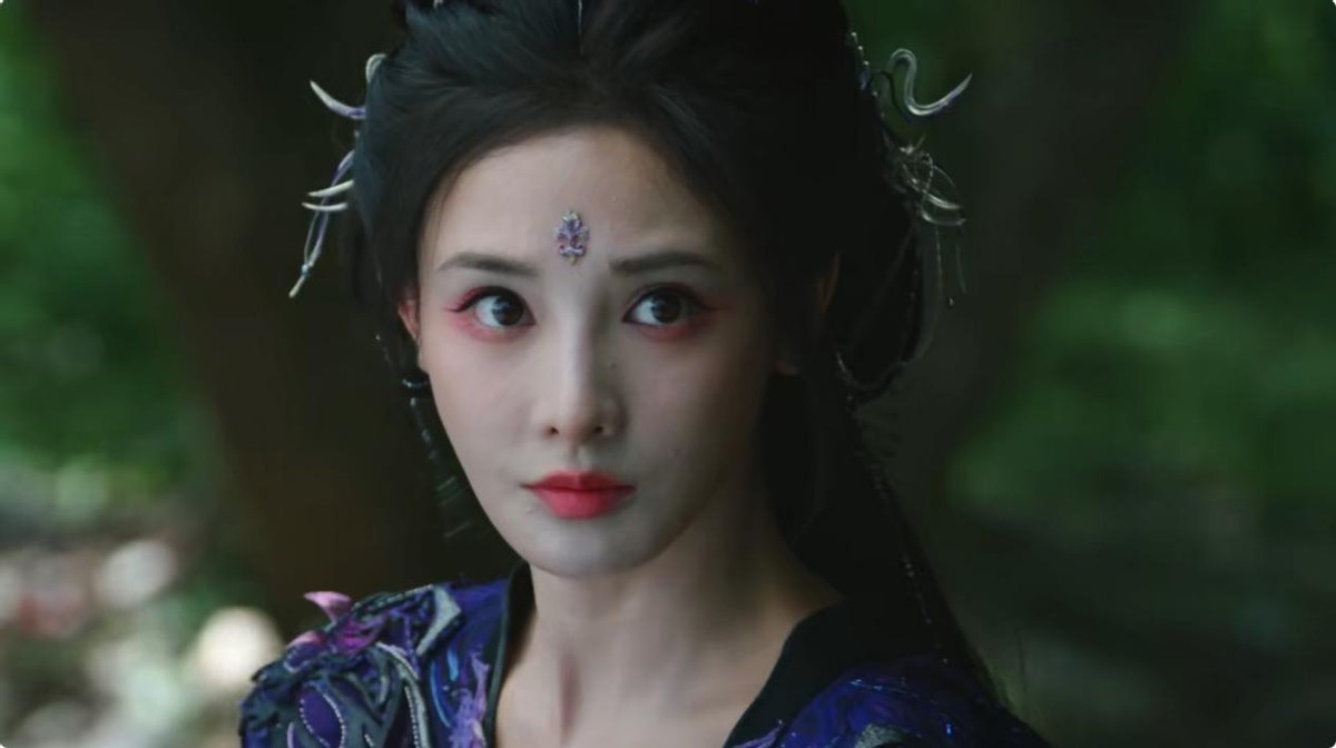 紫衣衬肤、金纹勾边,她在镜头里像一团紫焰,美得不真实。