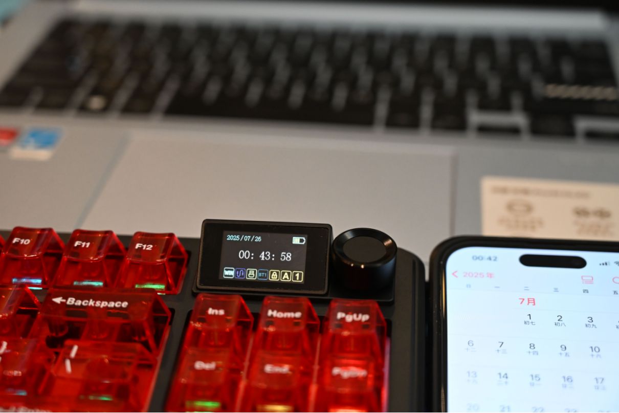 大电池不用频繁找充电线,彩屏显示电量、连接状态,直观实用。打字时轴体手感舒适,长时间输入不累,就是侧翼灯光在办公环境开着,偶尔会觉得有点“炫”,不过好在可以随时通过FN+旋钮进行调节或者关闭。