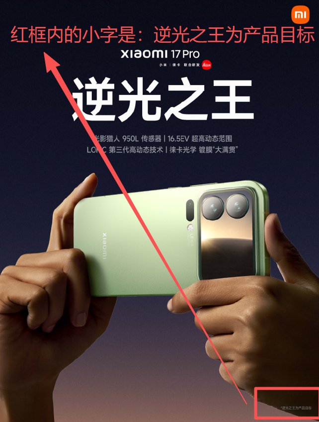 除了汽车,小米手机在宣传上面也有类似的操作。比如下面这张海报:你可能收获的信息是小米17 PRO拍照牛逼,逆光之王。但实际上,你可能误解了小米的宣称初衷,小米只是想告诉你,逆光之王只是小米 17 PRO的产品目标。