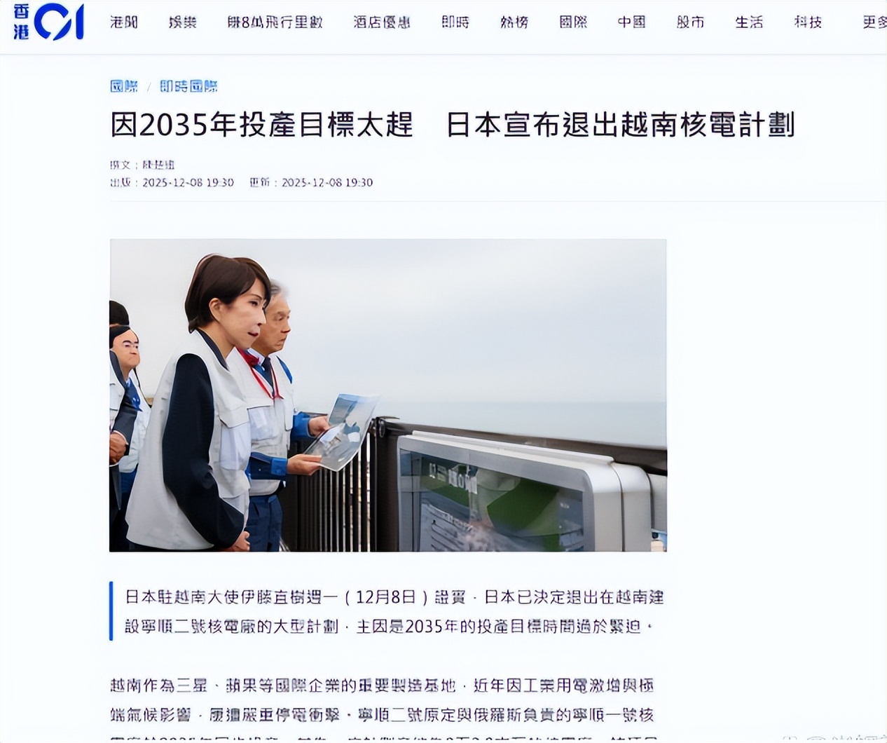 2025年12月8日,日本驻越南大使伊藤直树宣布,日方将全面退出越南宁顺第二核电站的建设计划。