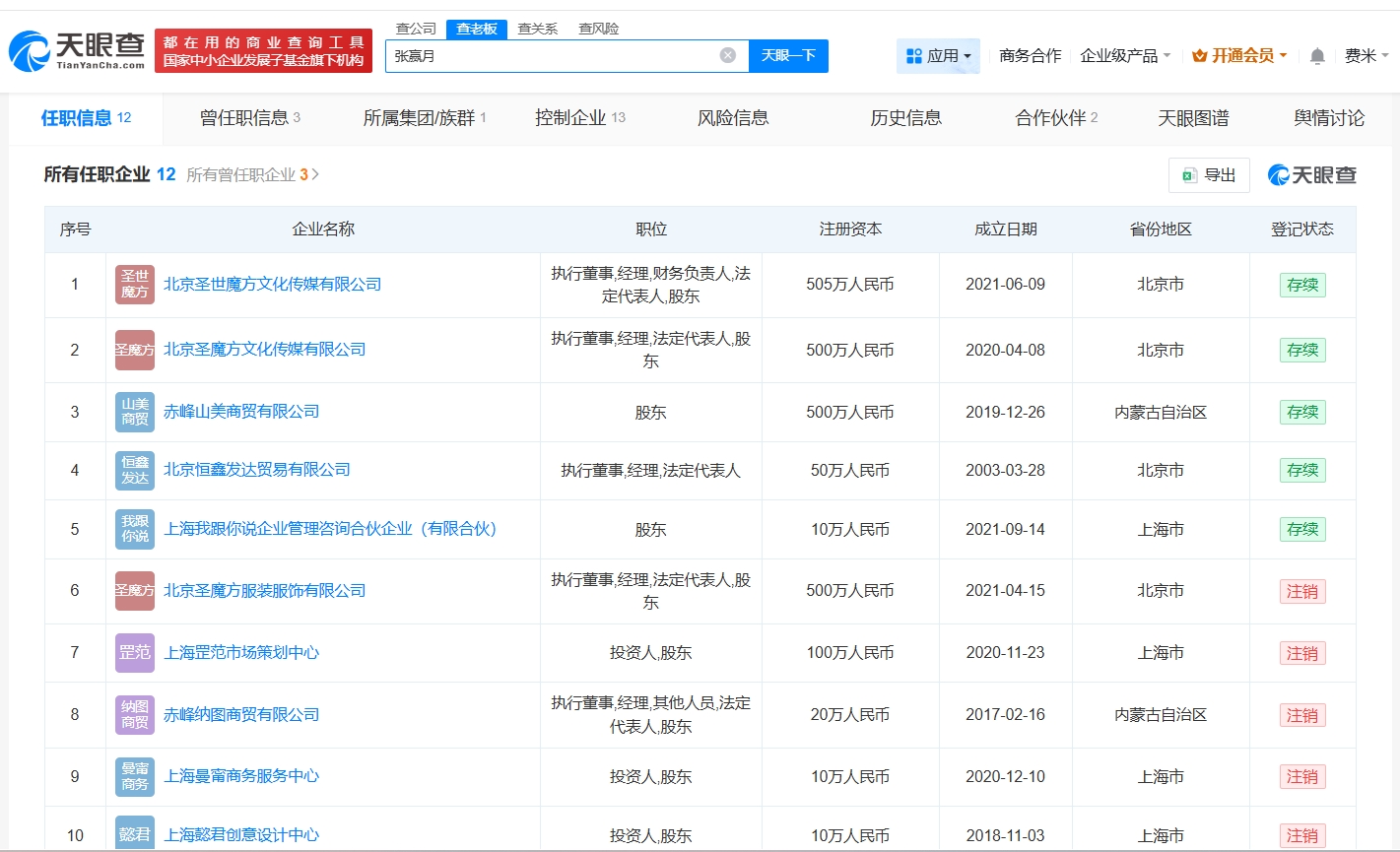 天眼查App显示,张赢月(网红我是张凯毅)名下关联12家企业,其中5家企业处于存续状态,包括等,张赢月在上述公司担任执行董事、经理等职务,其余7家企业已注销。