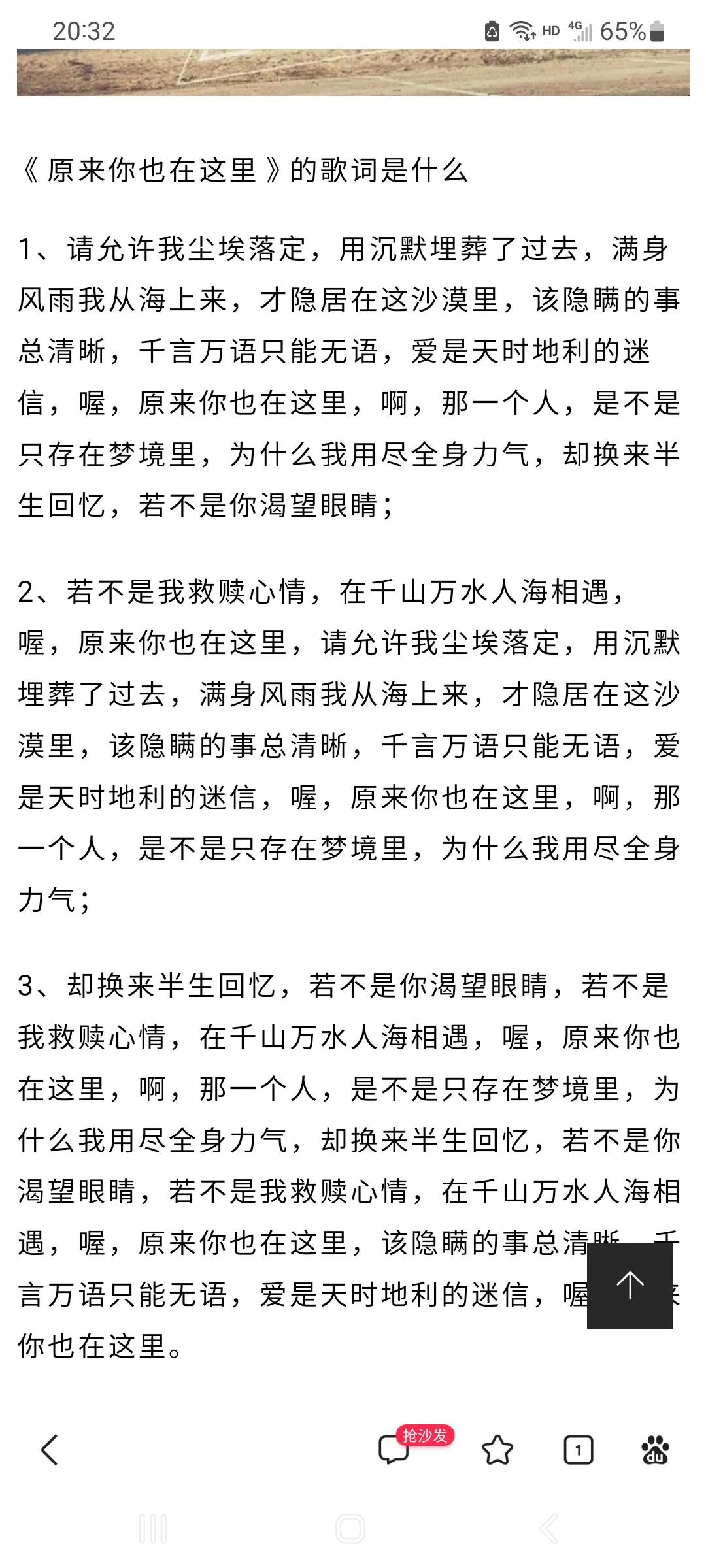 请允许我尘埃落定, 用沉默埋葬了过去, 满身风雨我从海上来, 才隐居在这沙漠里; 该隐瞒的事总清晰, 千言万语只能无语, 爱是天时地利的迷信, 噢,原来你也在这里。 啊那一个人是不是只存在梦境里? 为什么我用尽全身力气却换来半生回忆? 若不是你渴望眼睛, 若不是我救赎心情, 在千山万水人海相遇, 噢,原来你也在这里。