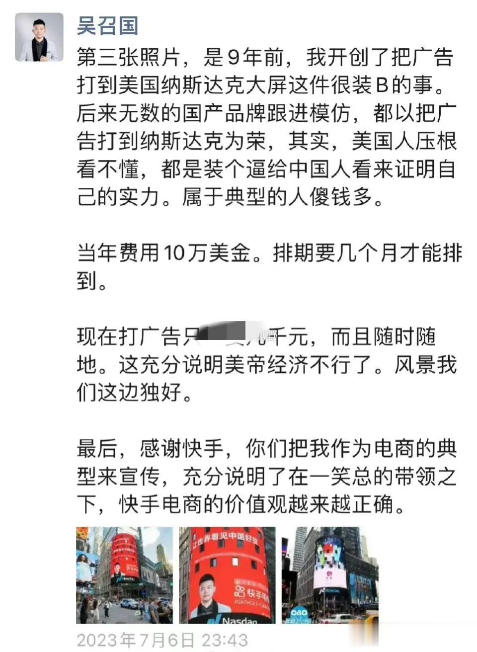继太原老葛之后,安九老师也开心的晒自己登上美国纳斯达克大屏,让全世界认识了安九,给快手争脸了。 但有媒体爆料称,无论是谁,只要花275元人民币就能上登上这个广告牌,停留15秒。组团上更便宜,250就够。 而吴召国则透露自己其实9年前就上过了,当年的费用是10美金,而且要几个月才能排到。现在只需要几百,说明美帝经济不行了。