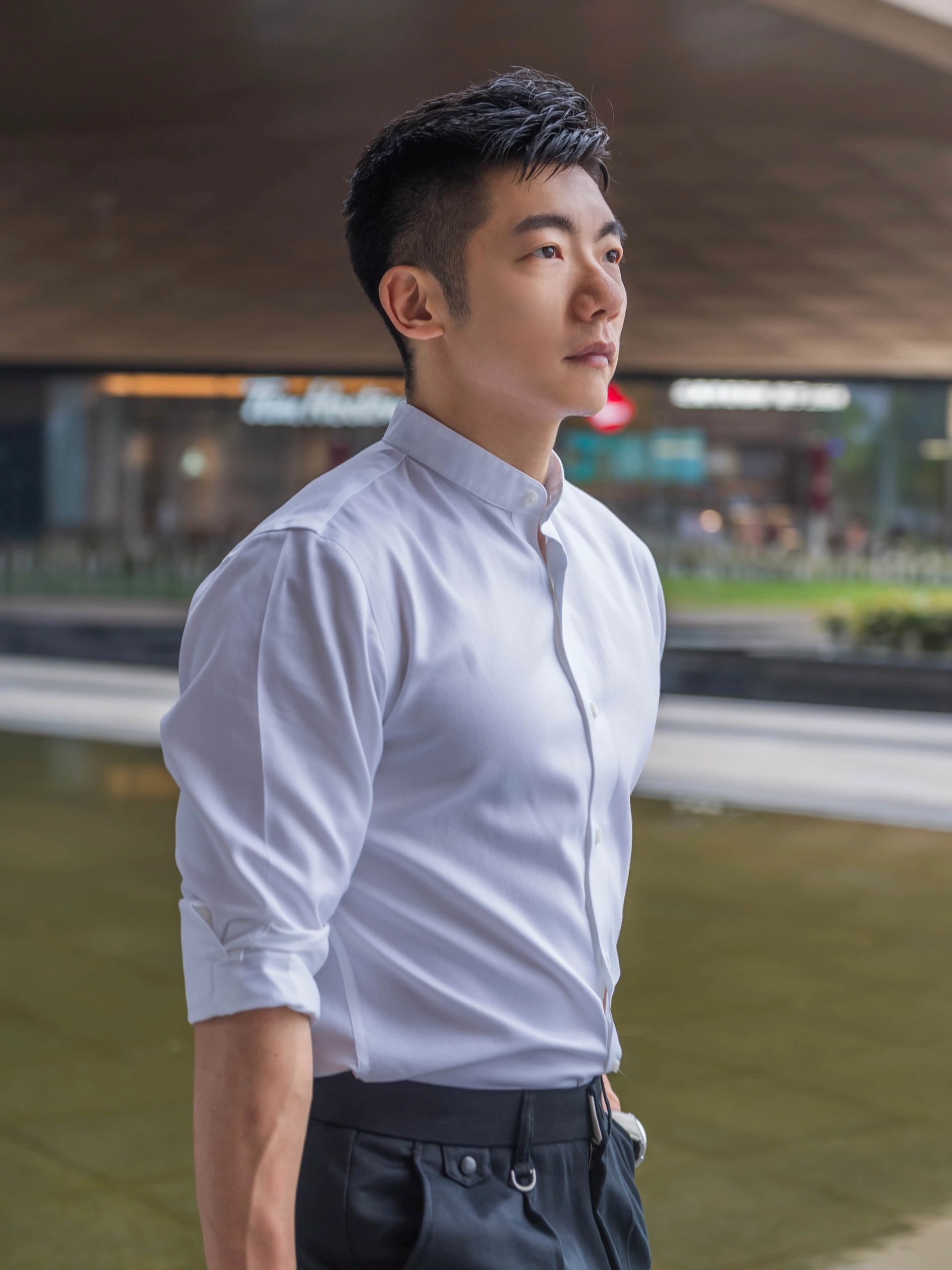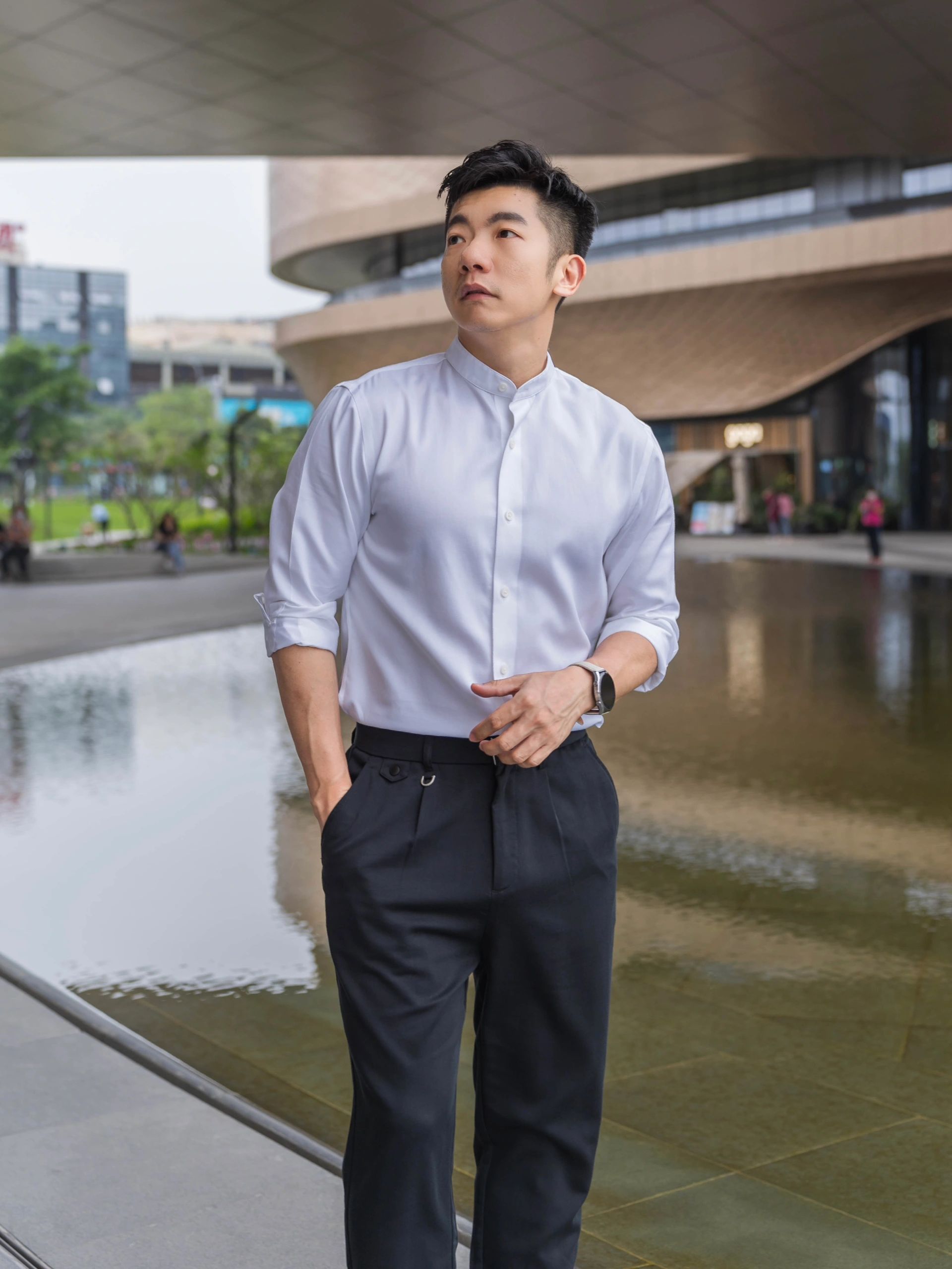 look2平时衬衫穿搭一般都是选标准领居多,这次选的是一款白色的立领商务衬衫。这款纯棉衬衫的汗无痕技术的加持,夏天我经常有穿衬衫的需求,汗渍不显现的这一技术真的太戳我了。并且这件衬衫还是免烫的!