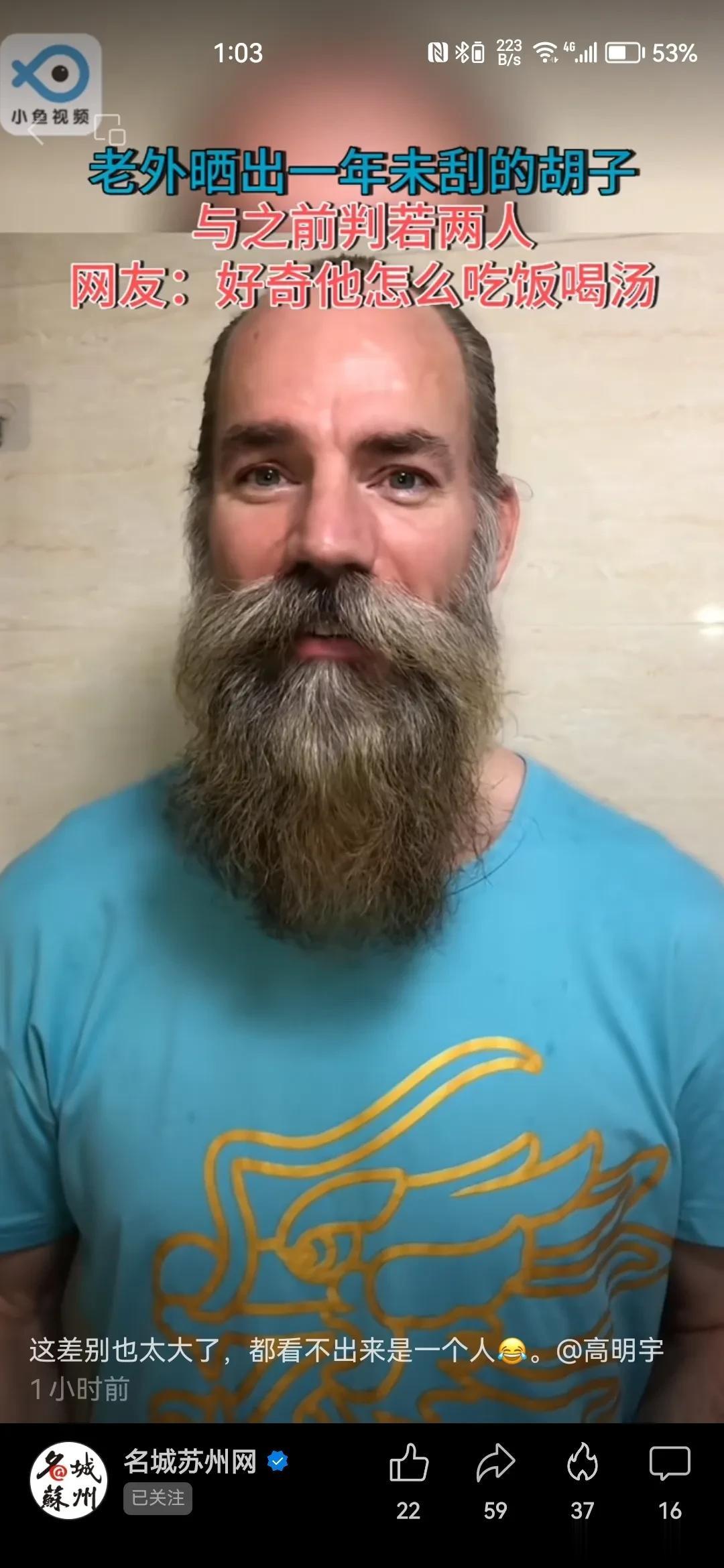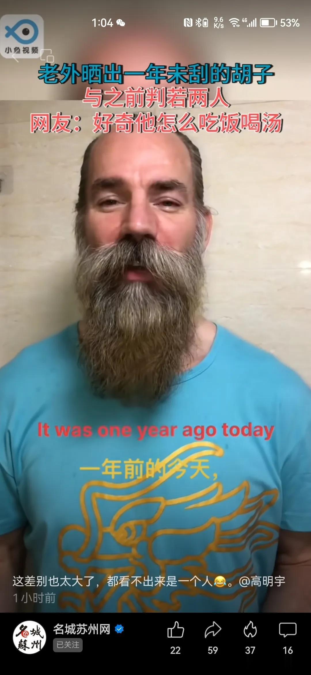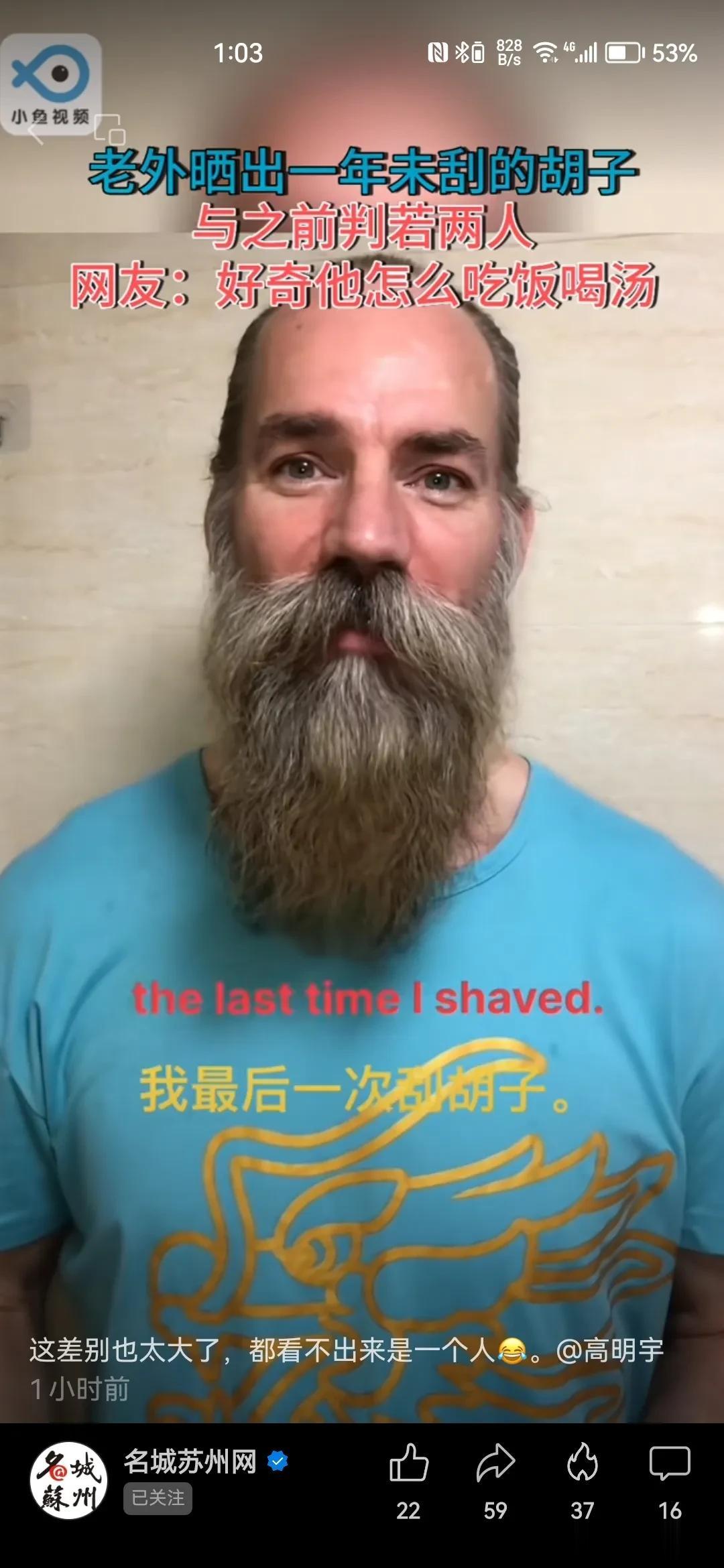 一年不刮胡子,长相会有多大的变化呢? 一个据说生活在苏州的外国人,用一年的时间亲身做了一个体验。 很多网友看完之后感觉是变了另外一个人。还有人很好奇,长了这么长的胡子怎么吃饭喝水? 我觉得这个担心有点过度了。 这位外国朋友依旧是身强力壮的,无论多长的胡子,都不会影响一个人的饮食的对不对?
