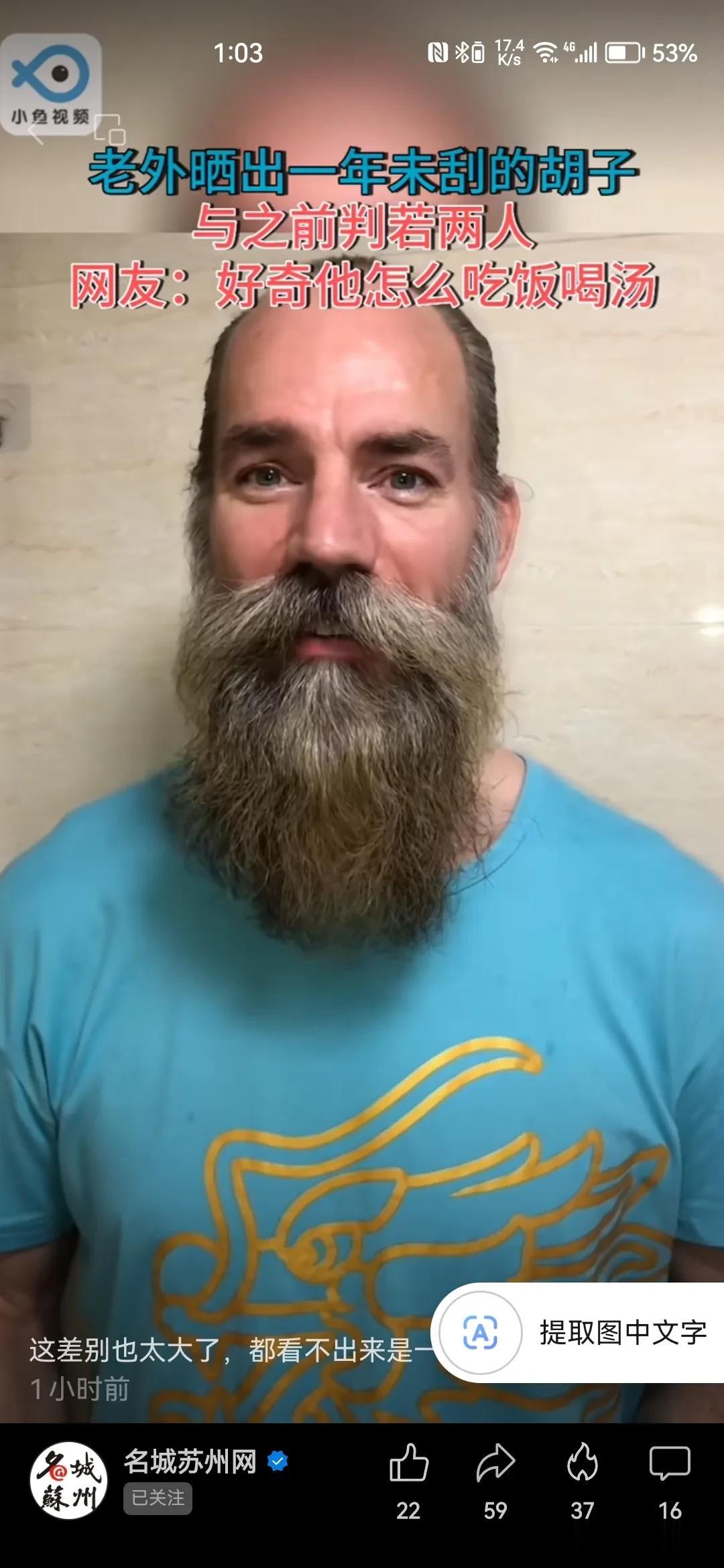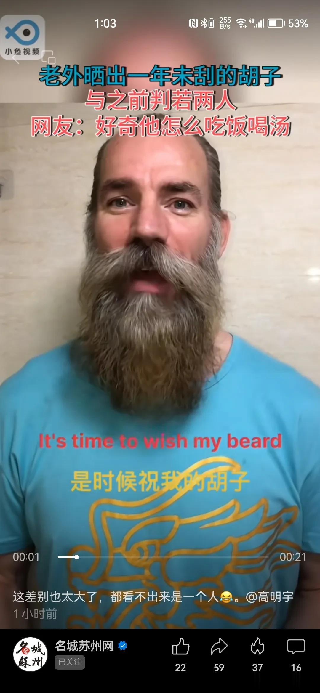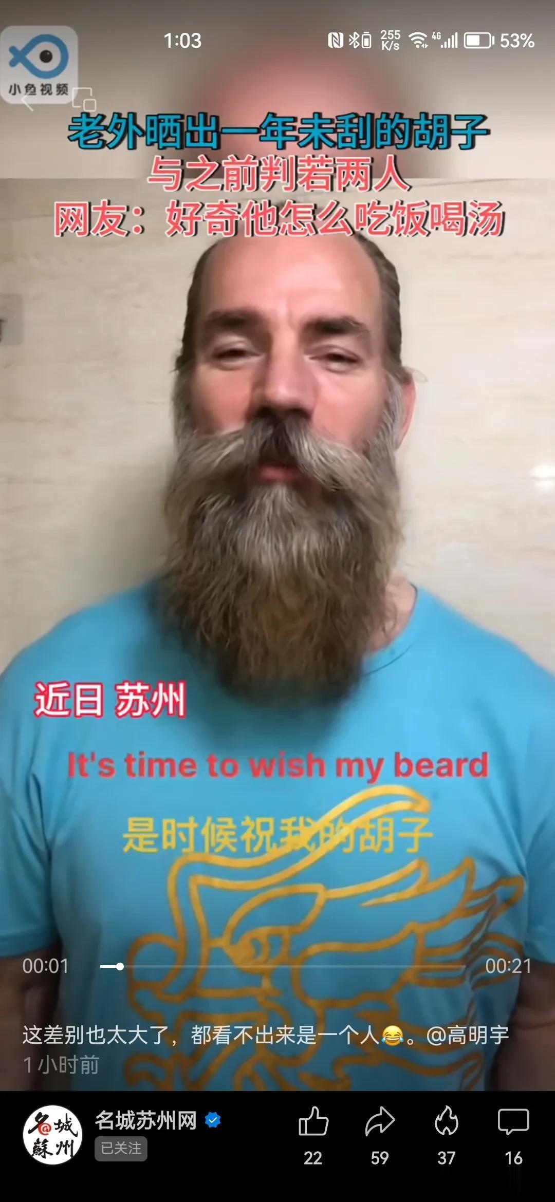 一年不刮胡子,长相会有多大的变化呢? 一个据说生活在苏州的外国人,用一年的时间亲身做了一个体验。 很多网友看完之后感觉是变了另外一个人。还有人很好奇,长了这么长的胡子怎么吃饭喝水? 我觉得这个担心有点过度了。 这位外国朋友依旧是身强力壮的,无论多长的胡子,都不会影响一个人的饮食的对不对?