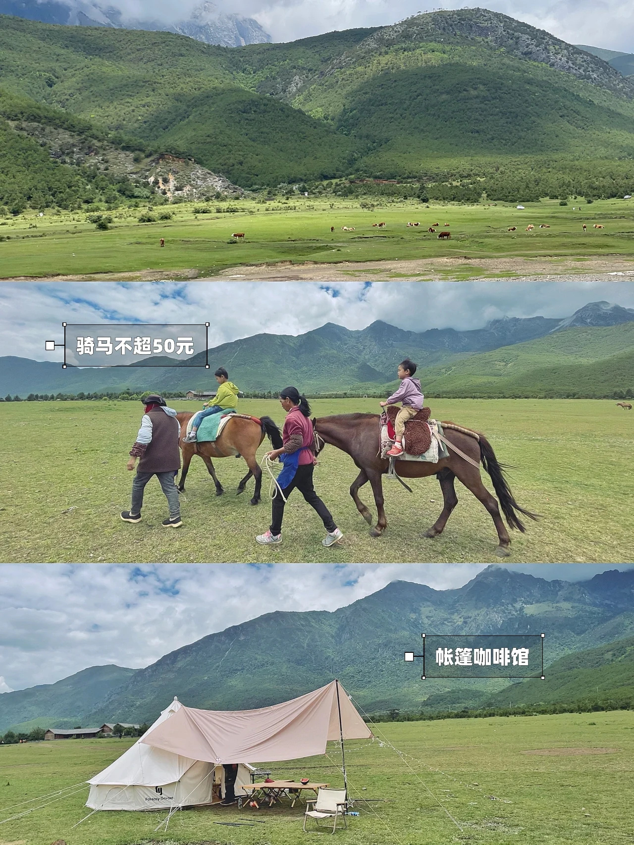 这里骑马很便宜,30-50元就可以绕湖一圈,半个小时左右,很适合小朋友体验。草原上有一家帐篷咖啡店,村民说如果时间不长的话也可以自己扎帐篷,不收费,还是很淳朴的。