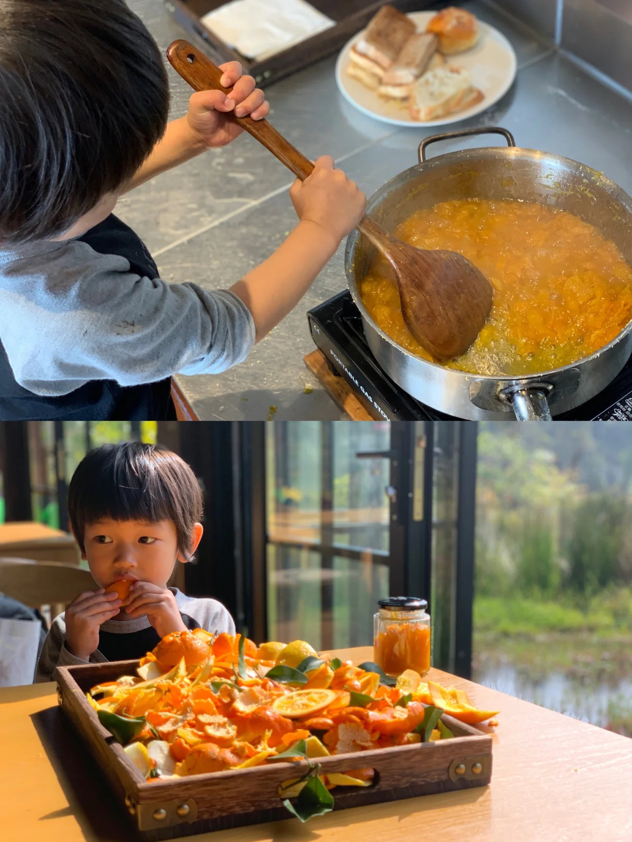 其实剥完橘子后,基本上就一直在搅拌搅拌搅拌....孩子一开始会很感兴趣,但持续不了太久,加上现熬的果酱也存放不了几天,所以2-3个孩子共同制作一份就好,量挺大的。