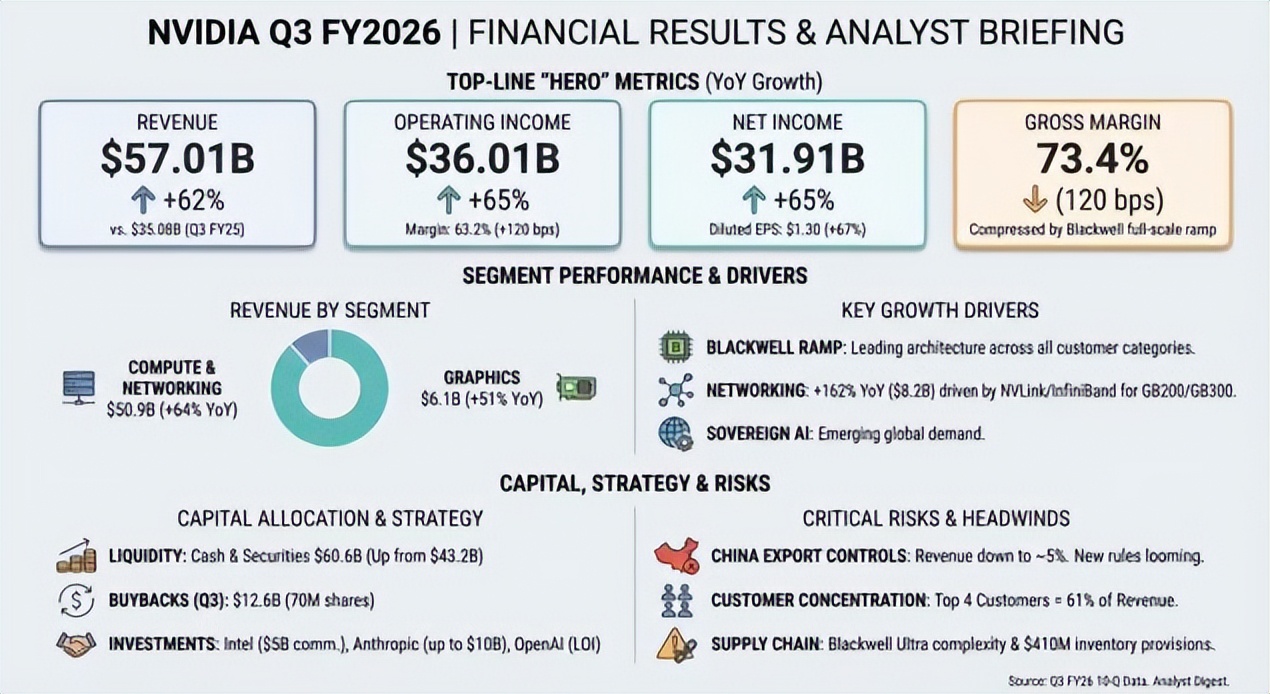 【提示词模版8】读取英伟达Q3财报PDF,提取营收、毛利率、同比增长、主要营收来源、风险提示,生成一页信息图:左侧大图展示营收趋势折线,右侧罗列5条要点并配简图标,底部给出一行“结论(一句话)”。