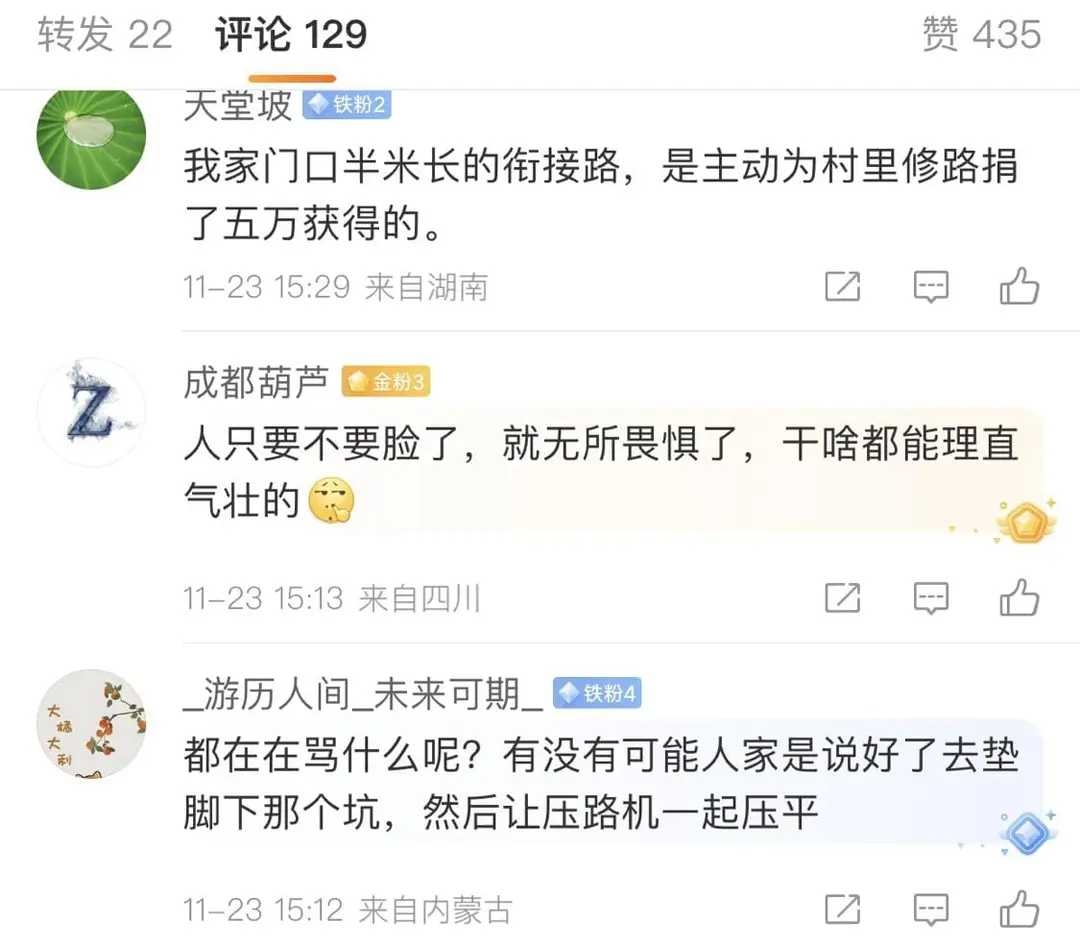 有网友说,我发现他们把填料就铲到旁边铺上,似乎他们所站位置是个坑凹,会不会是他们希望施工队把坑凹一并填平以保持道路整体平整,但施工方只能按图施工,双方沟通理解达不成一致,愚蠢的居民就开始胡来了?