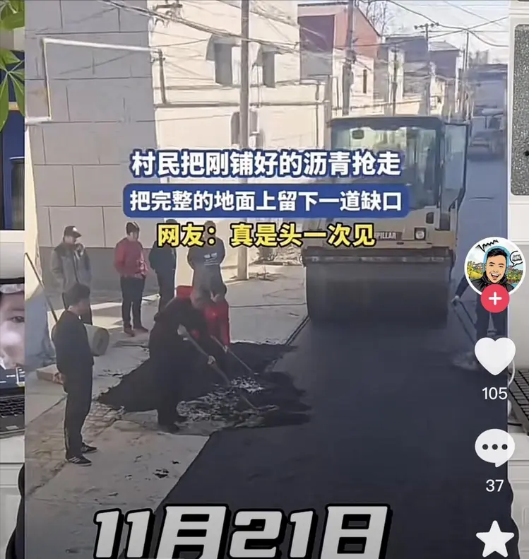 2025年11月21日,在河北某地一村里,一博主发视频吐槽,村里刚铺好的柏油路面,村里一大爷大妈转头就把沥青铲掉铺在了自己的家门口。