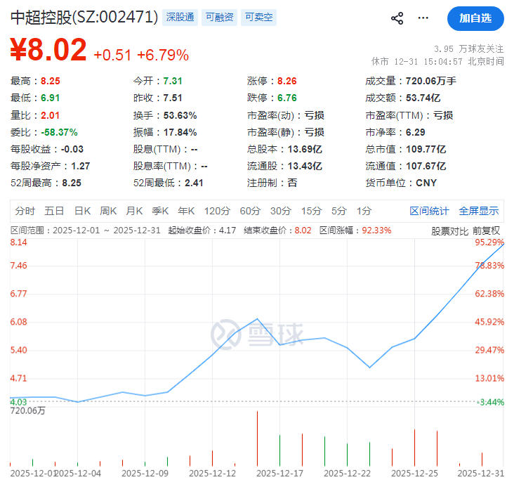 二级市场上,中超控股在2025年12月涨势明显,公司共发布了3条股价异动公告,其最新股价报8.02元/股,总市值109.77亿元。2025年12月,中超控股的整体涨幅超92%。