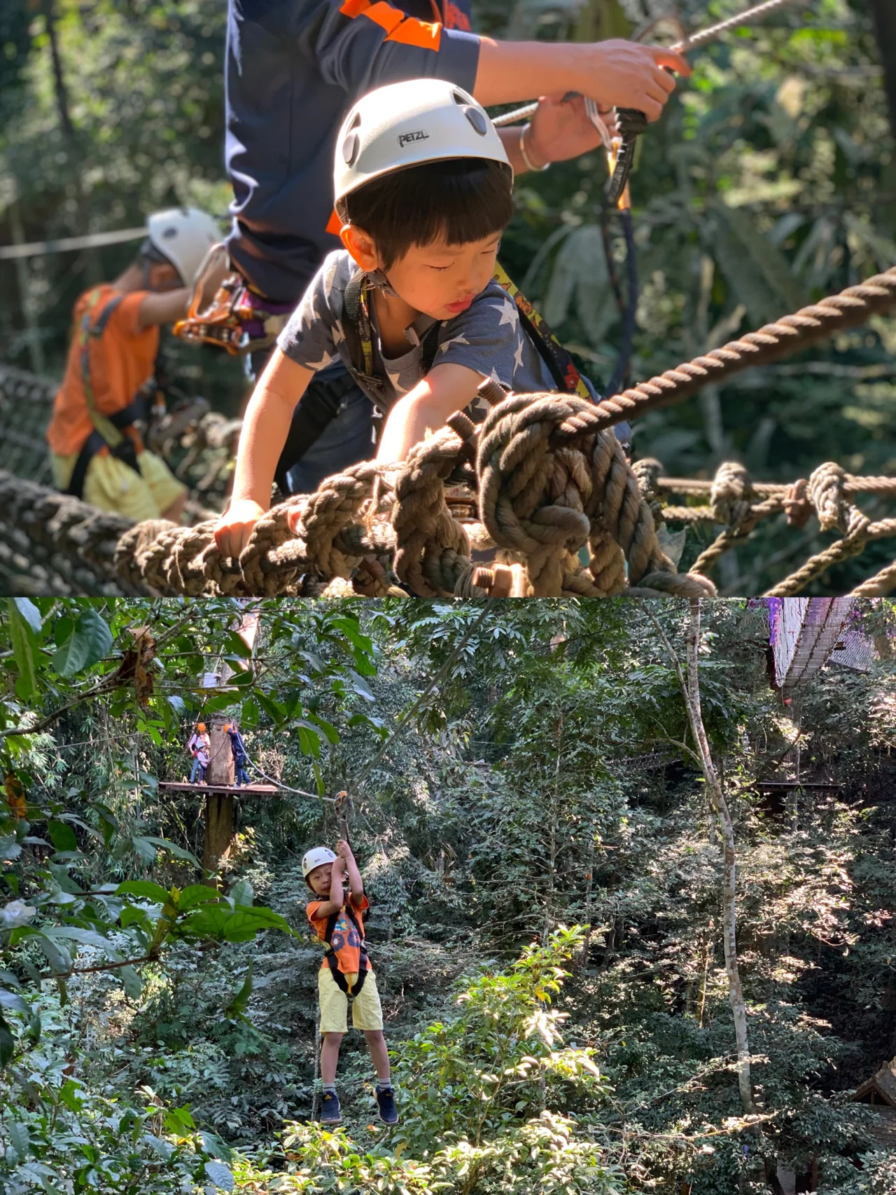 丛林飞跃:分A、B段,4岁以上只要孩子敢玩都可玩。同行3岁半95cm娃玩了A段ok,花费半小时,困难处工作人员会帮忙。