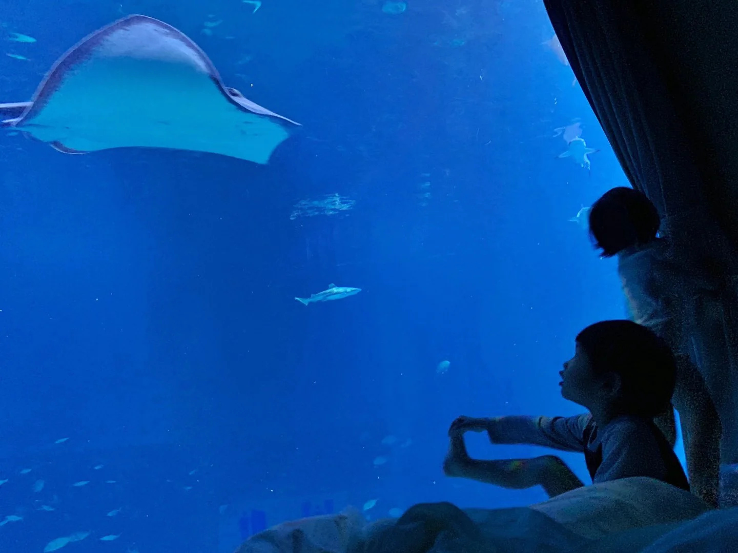 水族箱里的鱼数量很多,魔鬼鱼、鲨鱼、海龟这些都有,白天自然光,晚7点左右开灯至24点。