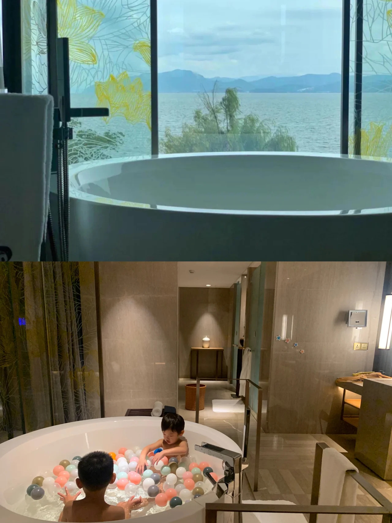 亲子房的空间很大,洗手间尤其奢侈,无论刷牙还是泡澡,甚至上厕所时也有一览无遗的洱海景色。